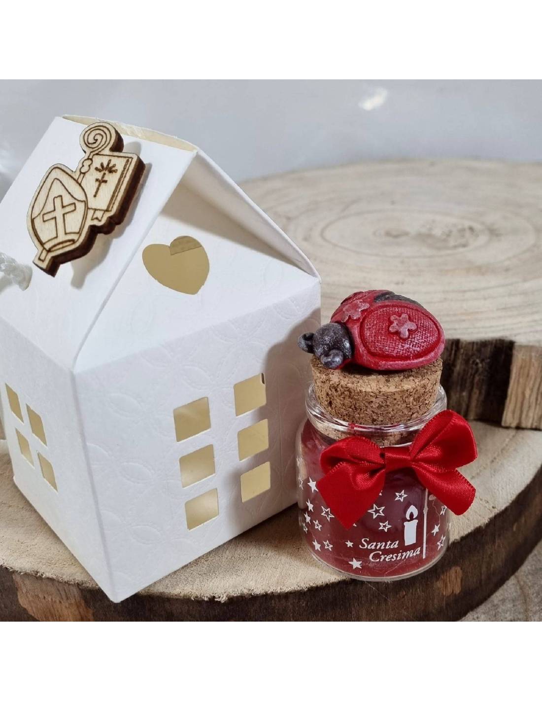 A casa arriverà la bomboniera con fiocco rosso e coccinella+ scatola a forma di casetta con tag legno cresima, puoi scegliere il sacchetto, confetti e