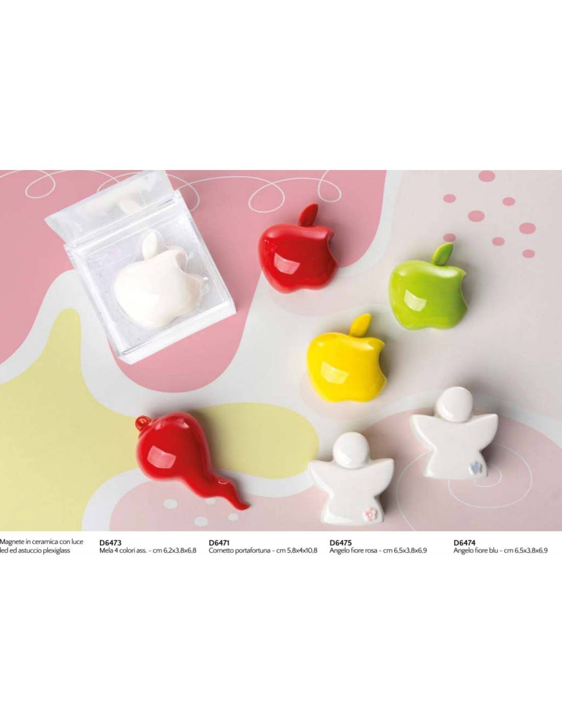 Bomboniere ceramica calamite led colorate con vasta possibilità di scelta tra mele, cornetto rosso o angioletti.