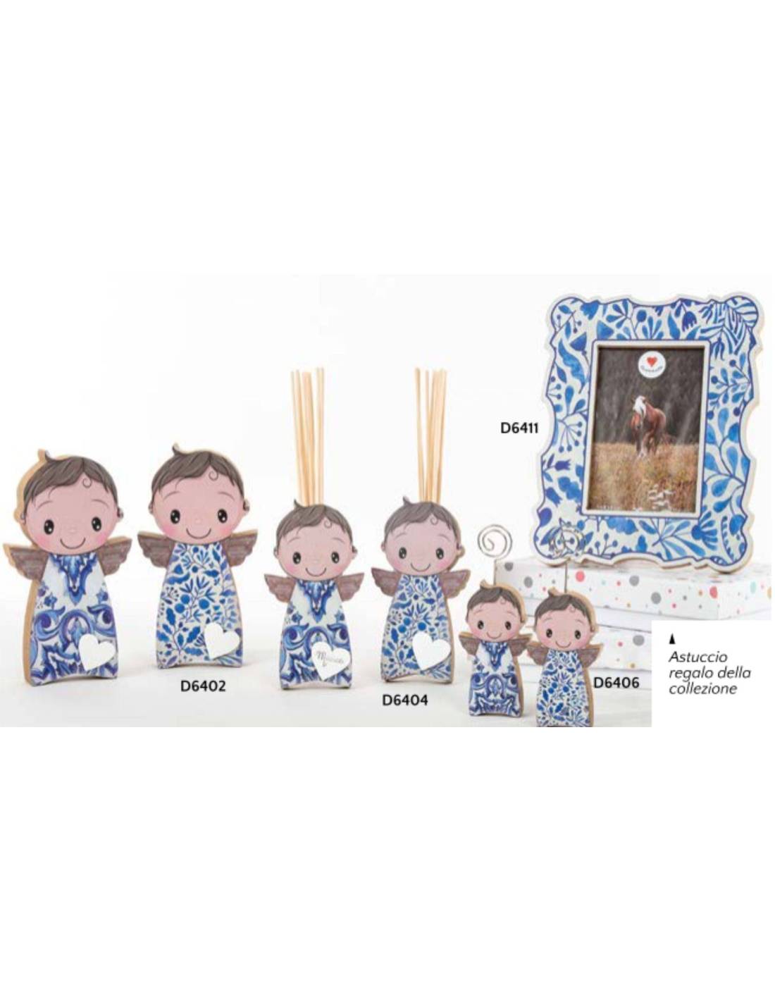 Imperdibile nuova collezione Cuorematto bomboniere angioletti bimbo con tunica celeste e cuore bianco personalizzabile con possibilità di scelta tra profumatore, segnaposto, decorazione parete e cornice portafoto.