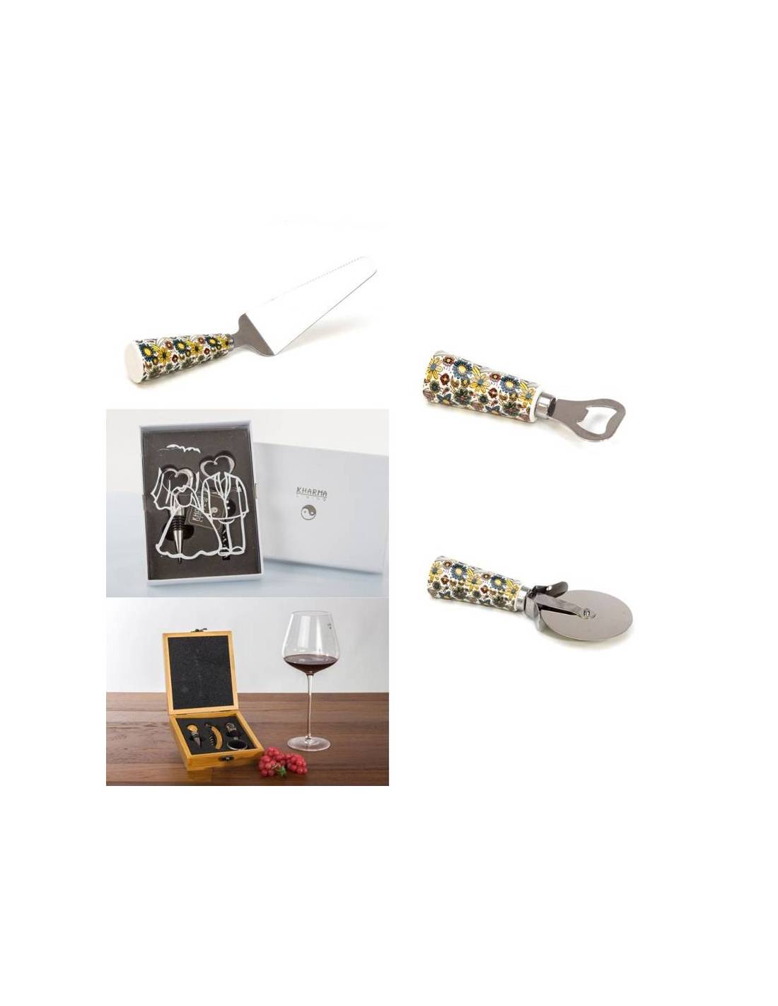 Bomboniere utili eleganti con vasta possibilità di scelta tra tagliapizza, apribottiglie, pala per torta, scatole attrezzi vino e cavatappi.