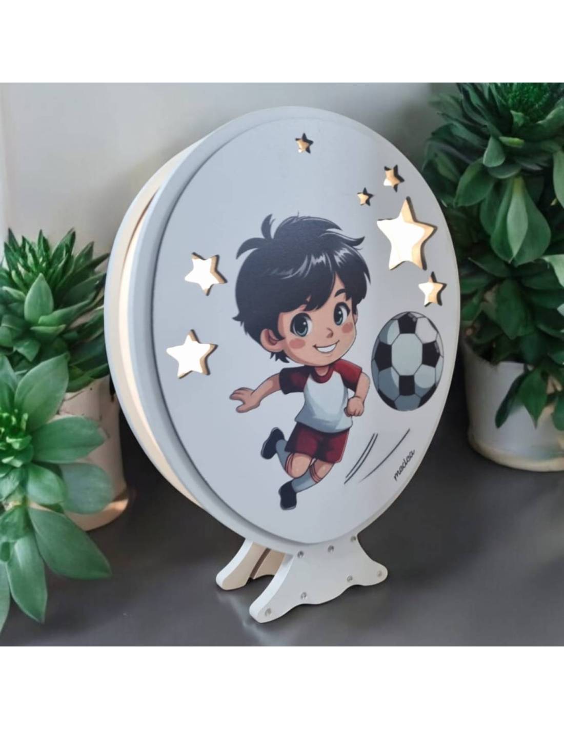 La bomboniera calcio che raffigura appunto un ragazzo che gioca a calcio e ha la forma di un palloncino e ha il telecomando per le luci che cambiano colore.