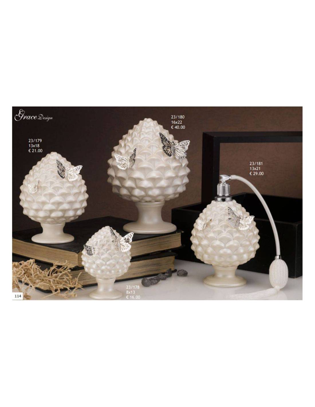 Cod.4 - 23/181 - Bomboniere profumi pigna con farfalle argentate (13x21cm circa).