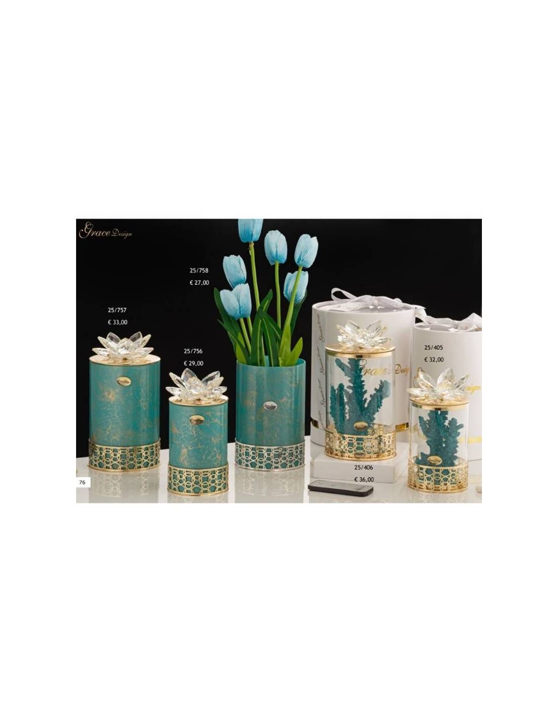Bomboniere raffinate ed eleganti candele profumate bellissimi contenitori con dettagli dorati e fiore cristallo su coperchio.