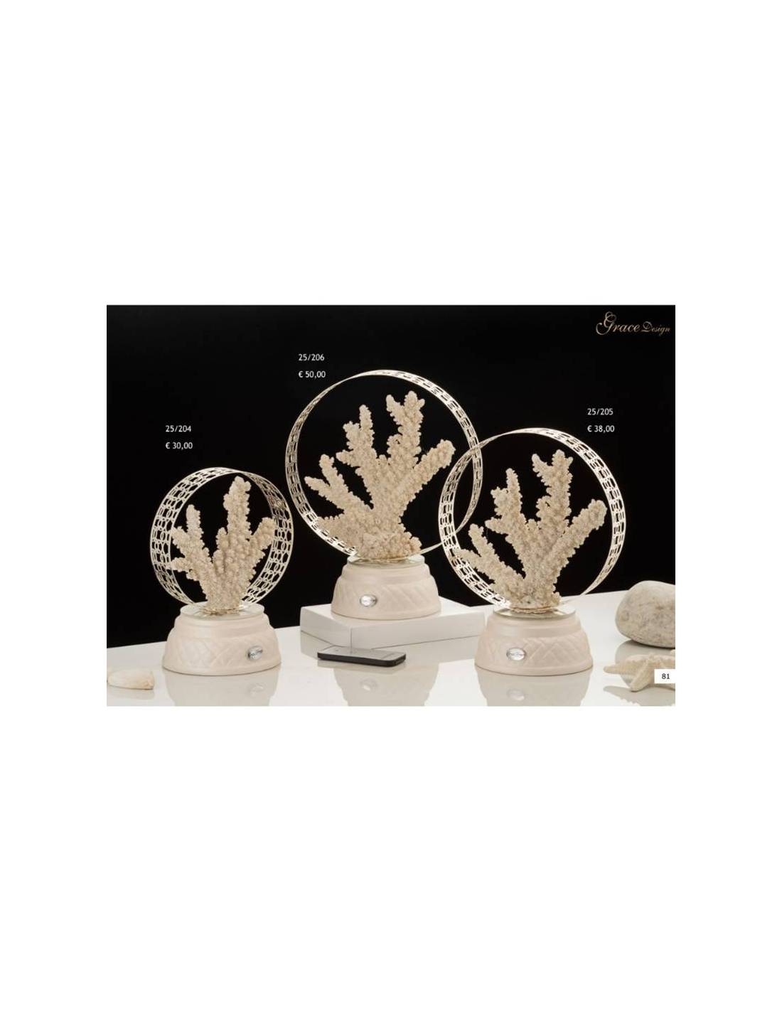 Bomboniere tema mare lampade luci led corallo in cerchio metallico dorato disponibili in diverse misure.