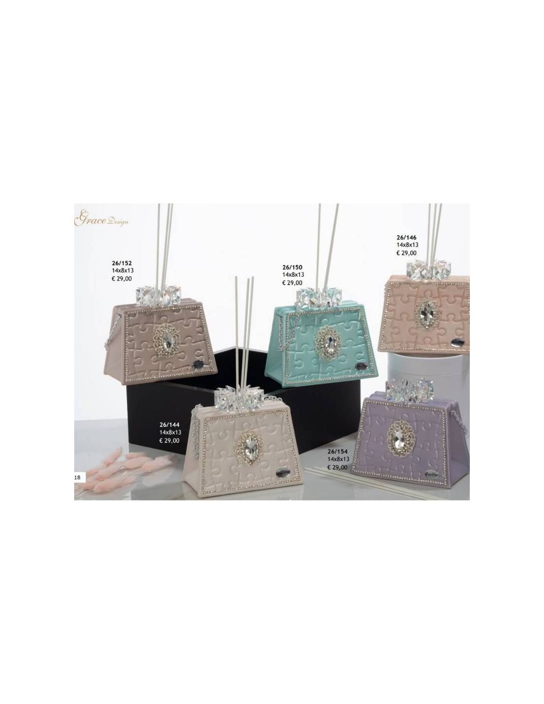 Bomboniere raffinate ed eleganti diffusori per ambienti a forma di borse motivo puzzle, dettagli argentati, applicazione gemma e decorazione al collo in cristallo.