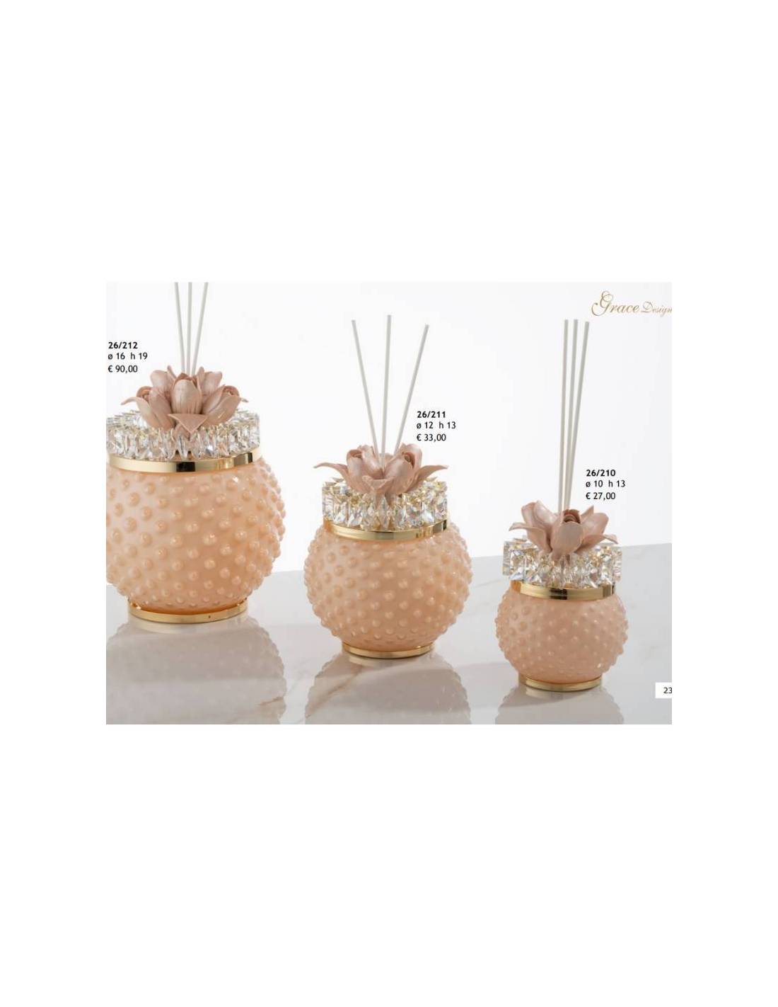 Portagioie bomboniera forma cilindrica design raffinato ed elegante in cristallo con dettagli dorati e fiore su coperchio.