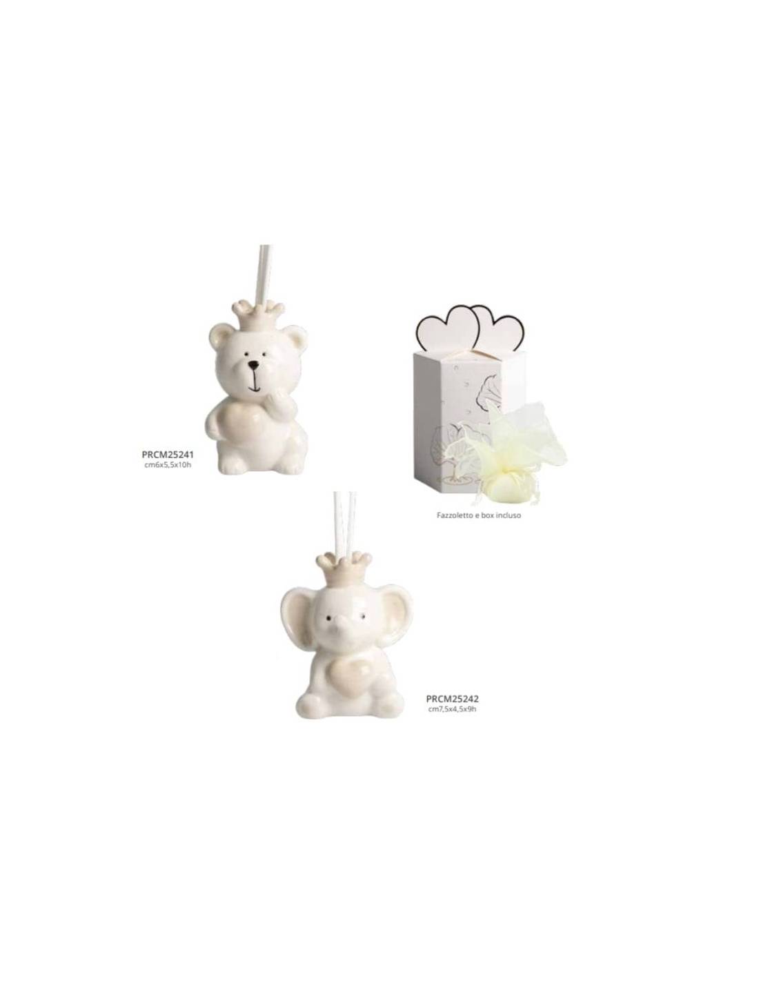 Diffusori per ambienti bomboniere animali in porcellana lucida con possibilità di scelta tra orsetto o elefante bianco e beige.