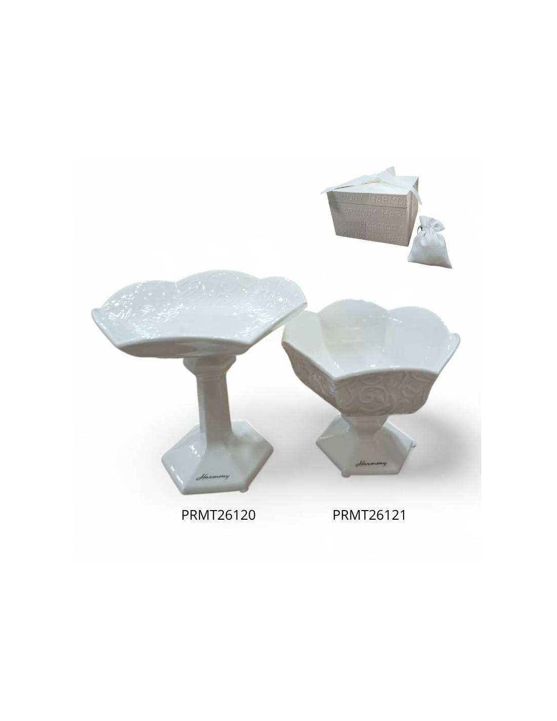 Bomboniere per Matrimonio in porcellana lucida bianca alzate e coppe con inclusa scatola e sacchetto portaconfetti.