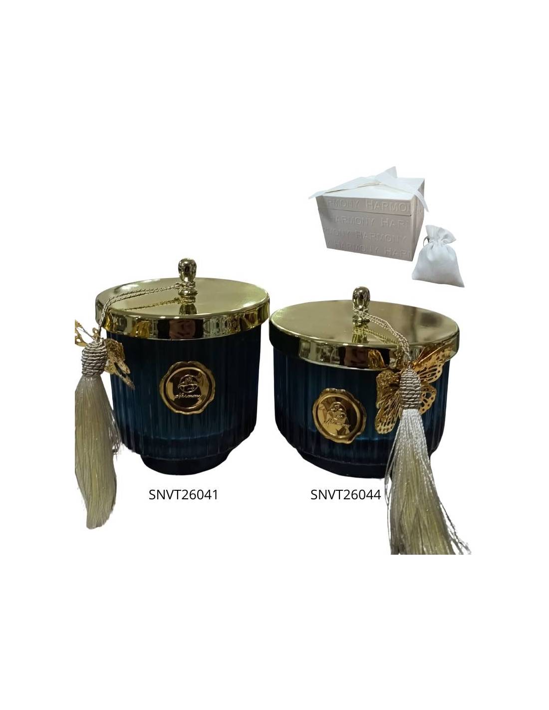 Bomboniere particolari e originali Harmony porta candele in vetro decoro farfalle dorate e nappa bianca con vasta possibilità di scelta.