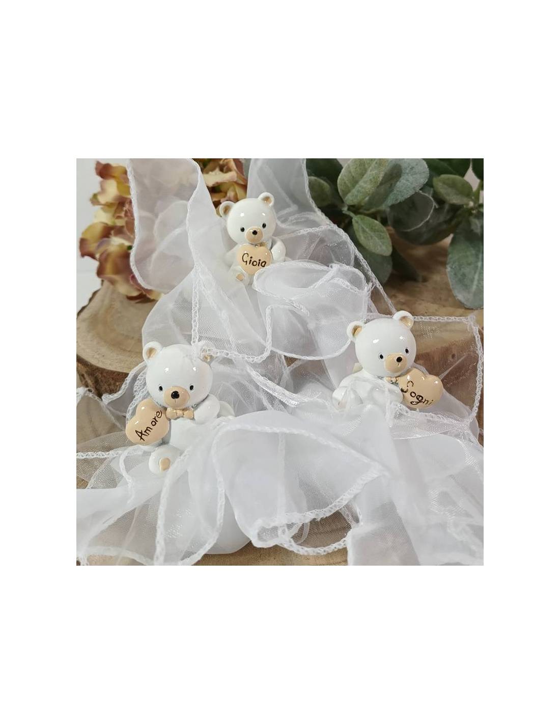 Bomboniere animaletti tenere statuine a forma di orsetti con cuoricini misti su sacchetti portaconfetti bianchi.