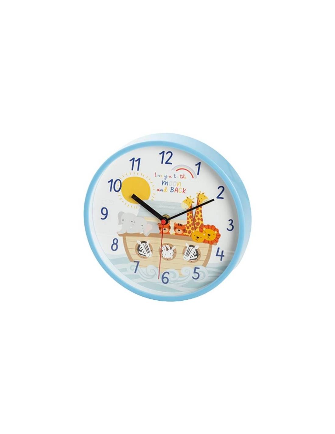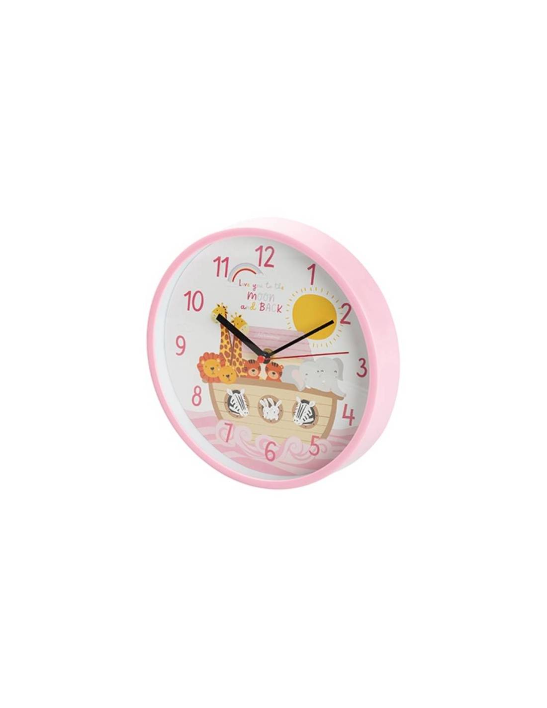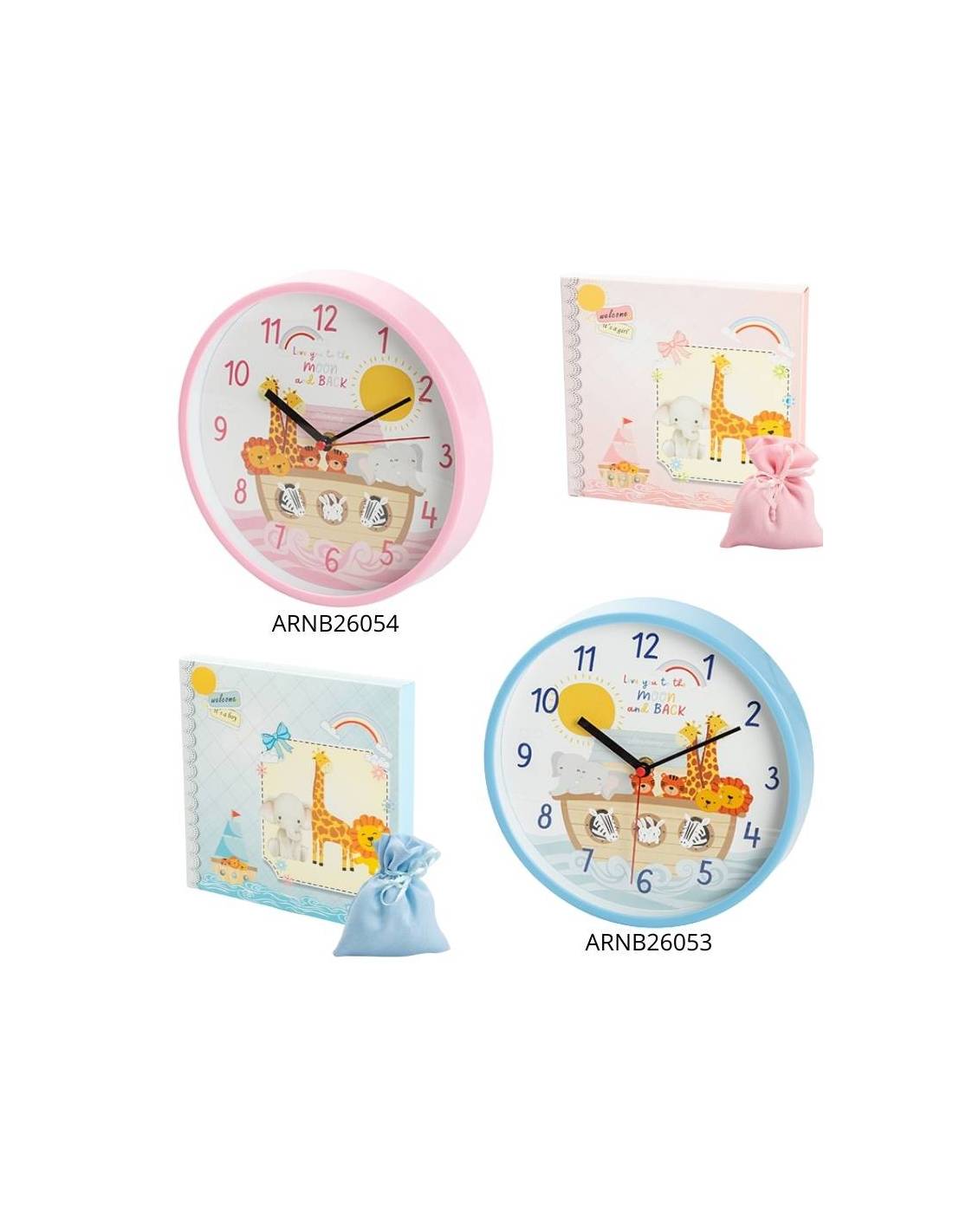 Bomboniera orologio tondo animaletti della savana con possibilità di scelta tra colore rosa o celeste frase "Love you to the moon and back".