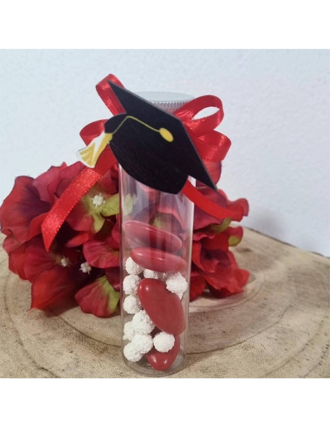 Queste bomboniere sono composte da una provetta in vetro con tappo avvitatore in metallo, perfetta per contenere confetti di alta qualità. Decorata con un elegante tocco in legno e un nastro rosso, la provetta diventa un ricordo unico e simbolico della tua laurea.
