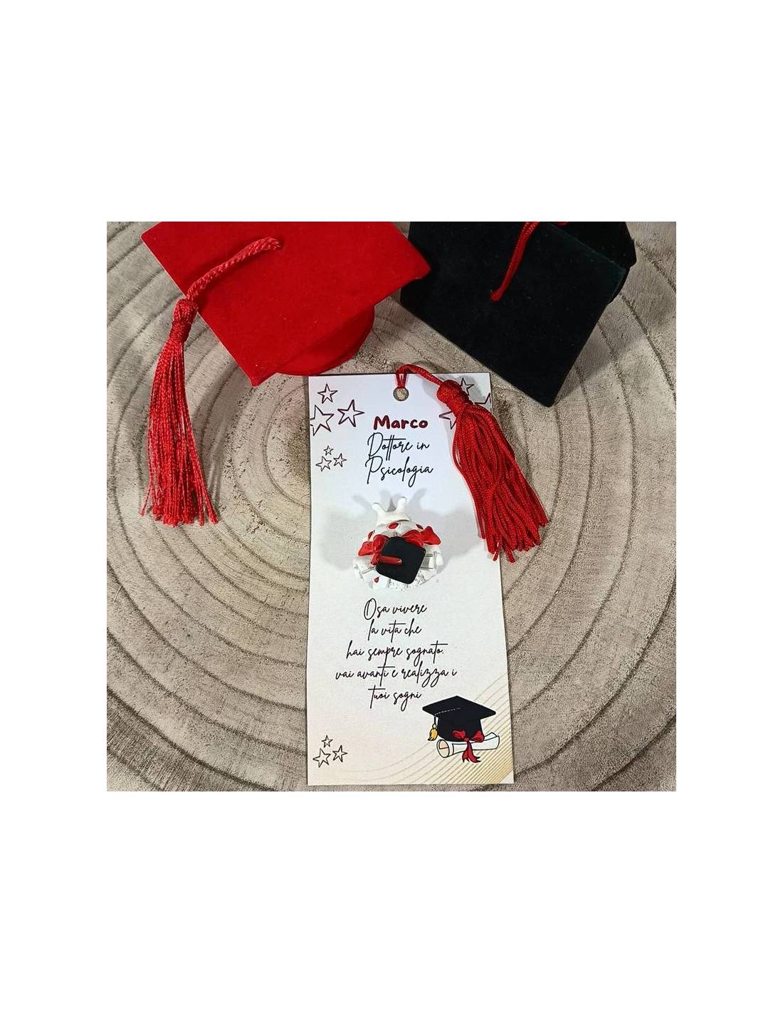 Segnalibro personalizzato forma rettangolare tema Laurea con coccinella con tocco nero, nappa rossa e frase 'Osa vivere la vita che hai sempre sognato. Vai avanti e realizza i tuoi sogni'.