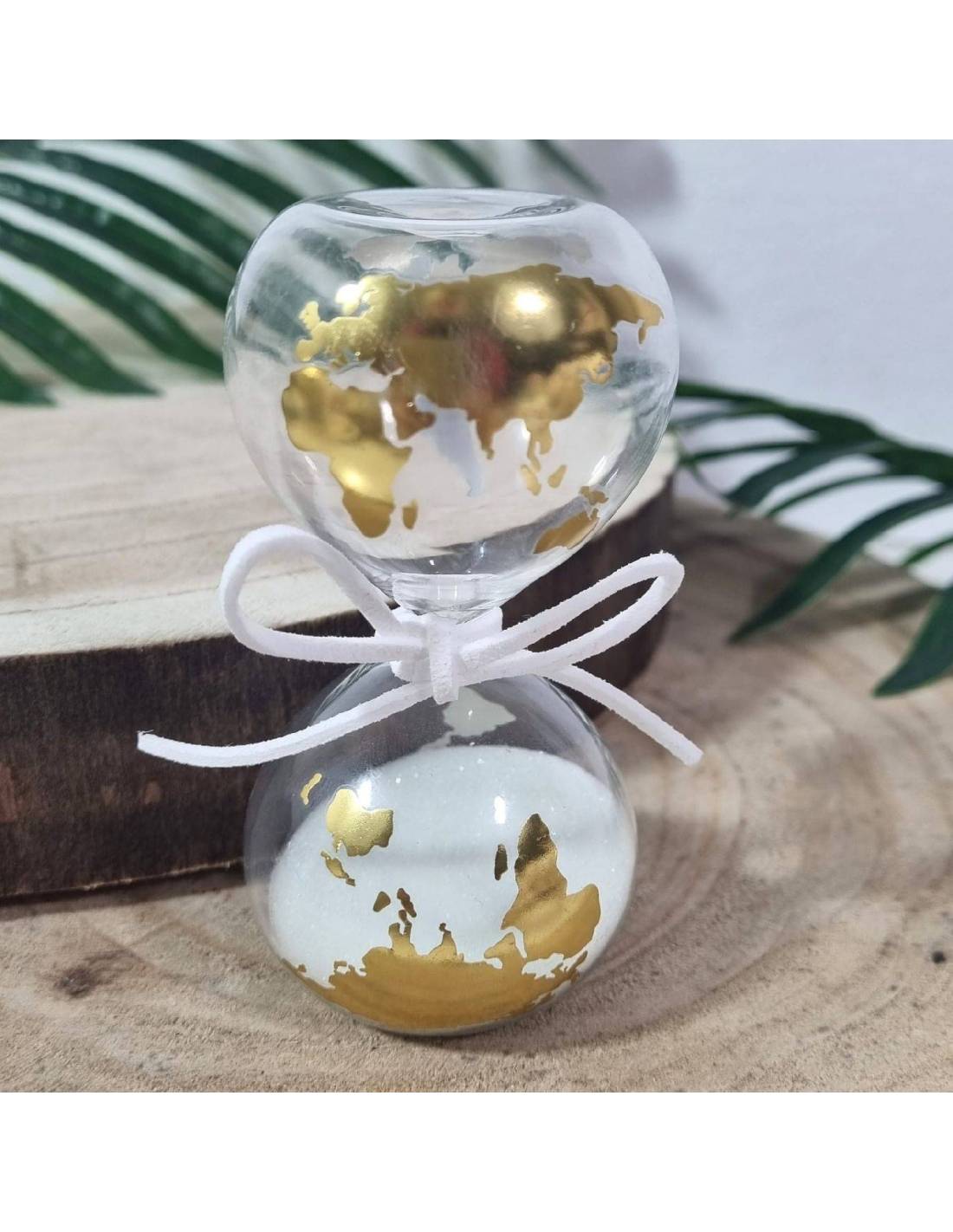 Bomboniere clessidre in vetro con sabbia bianca e la stampa della mappa del mondo in dorato.