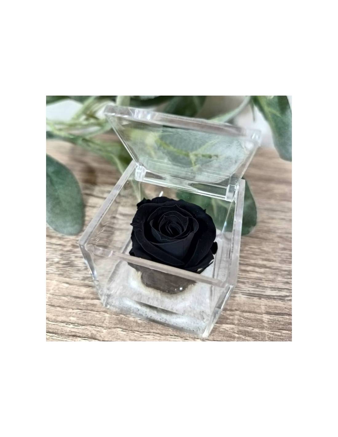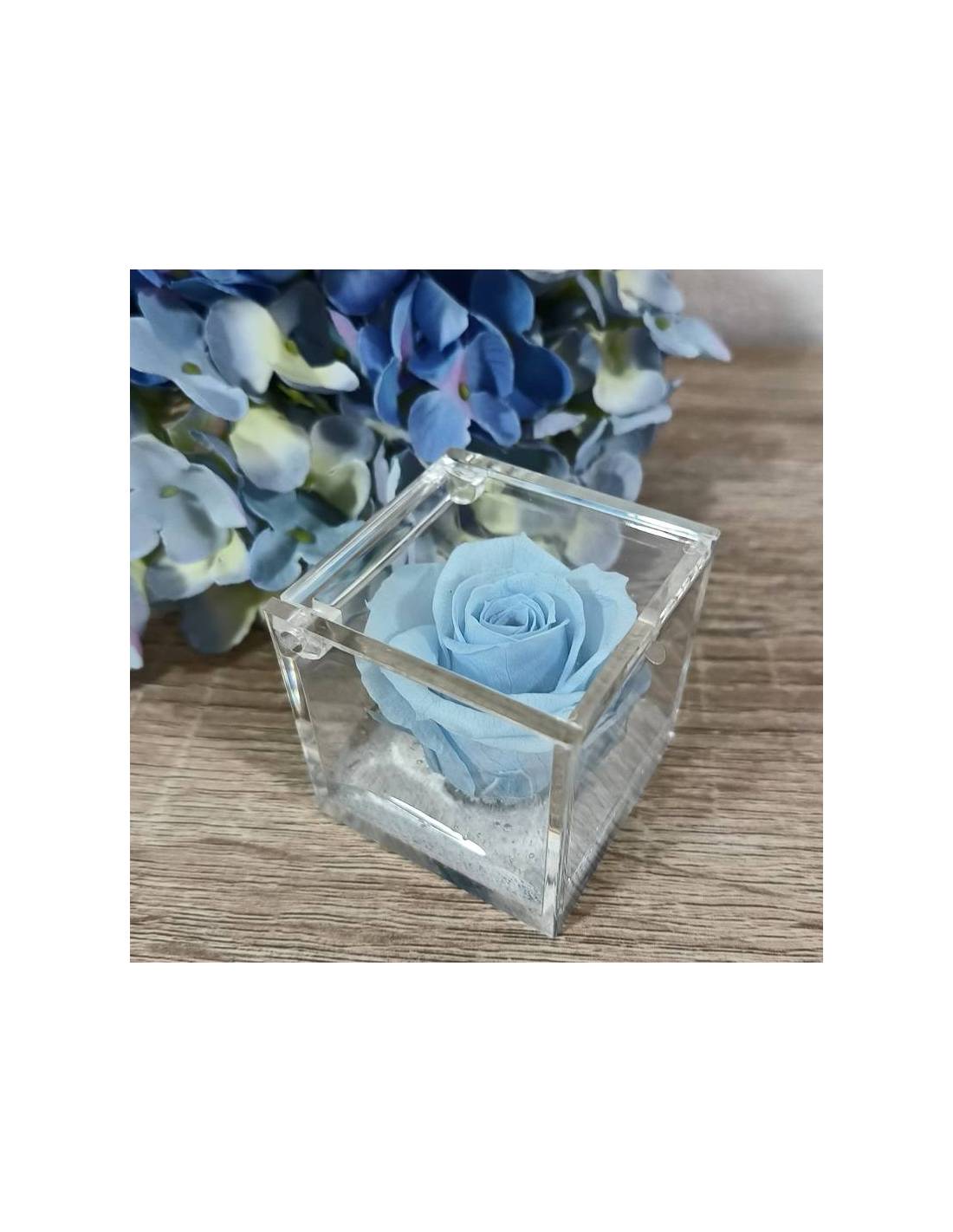 Elegante cubo in plexiglas con bomboniera rosa eterna incastonata nel gel.