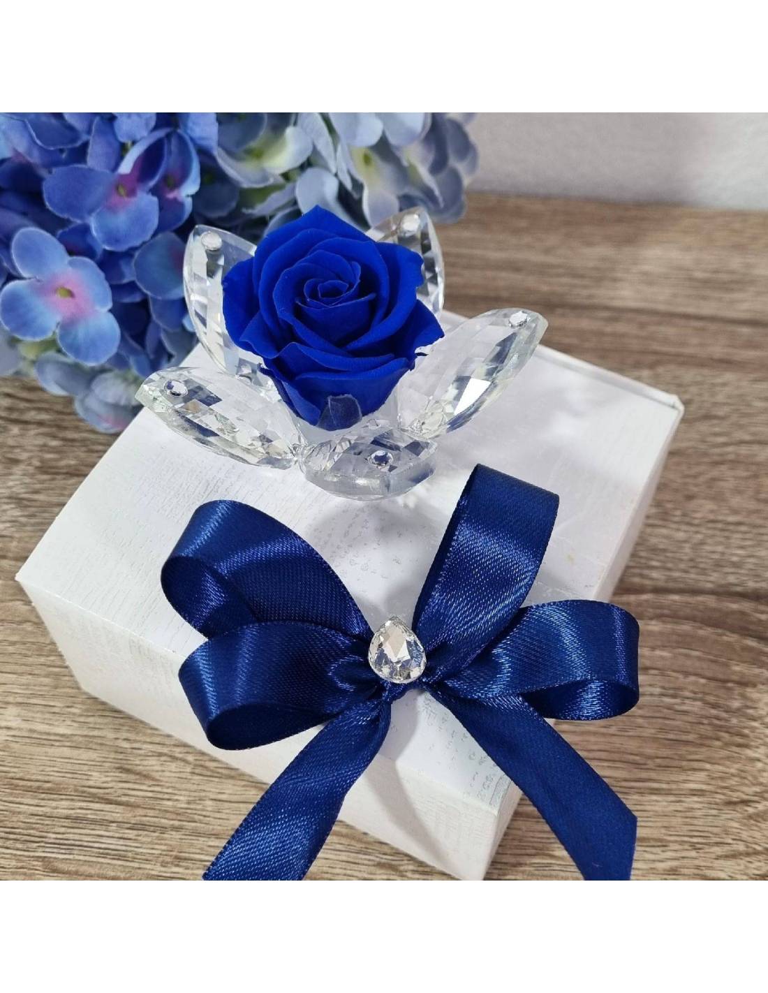 I fiori bomboniere di swarovski hanno al centro una rosa stabilizzata blu.