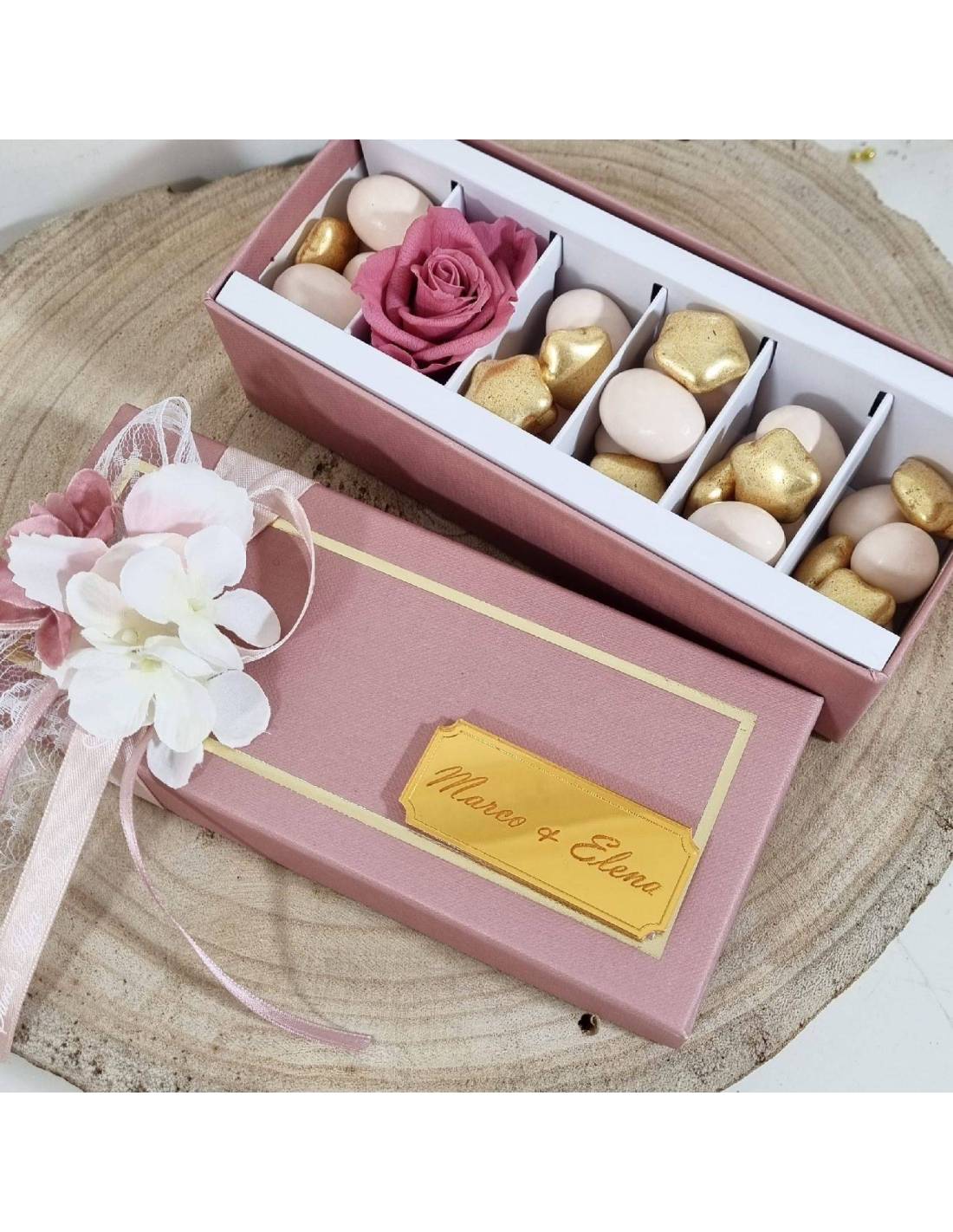 Rose stabilizzate bomboniere matrimonio di colore rosa antico in uno dei scomparti della scatola per confettata completa.