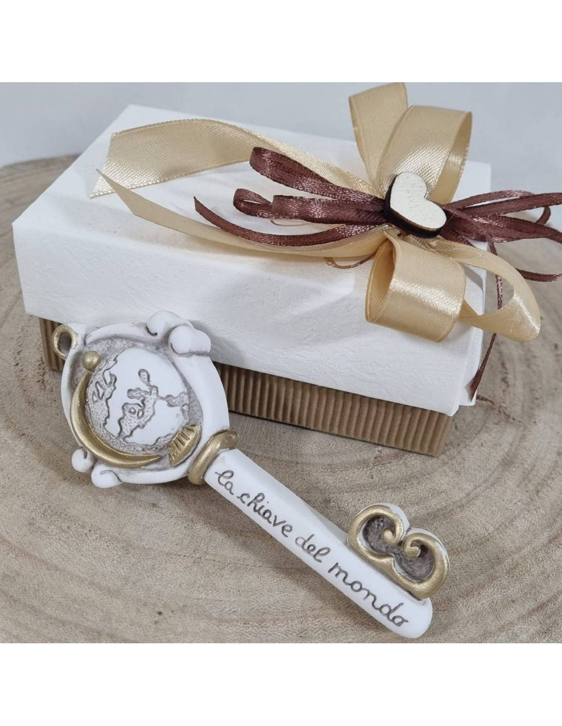 Incisa sull'asta della chiave bomboniera, vi è presente la frase "la chiave del mondo".