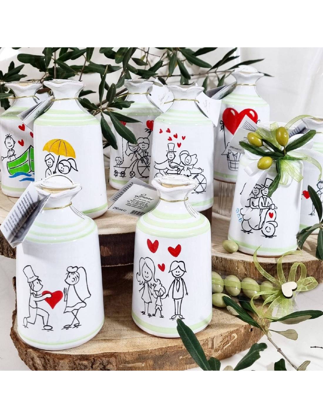 Bomboniere matrimonio olio in bottiglia di ceramica Pugliese dipinta a mano con vignette a scelta e con possibilità aggiungendo 1€ di avere le iniziali degli sposi.