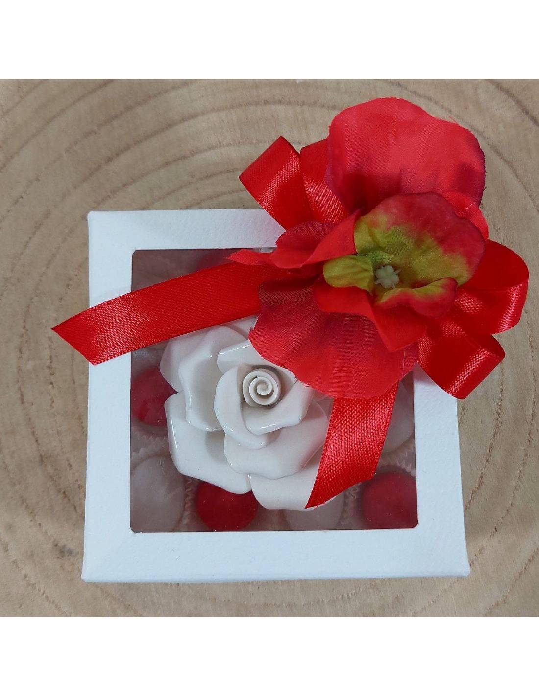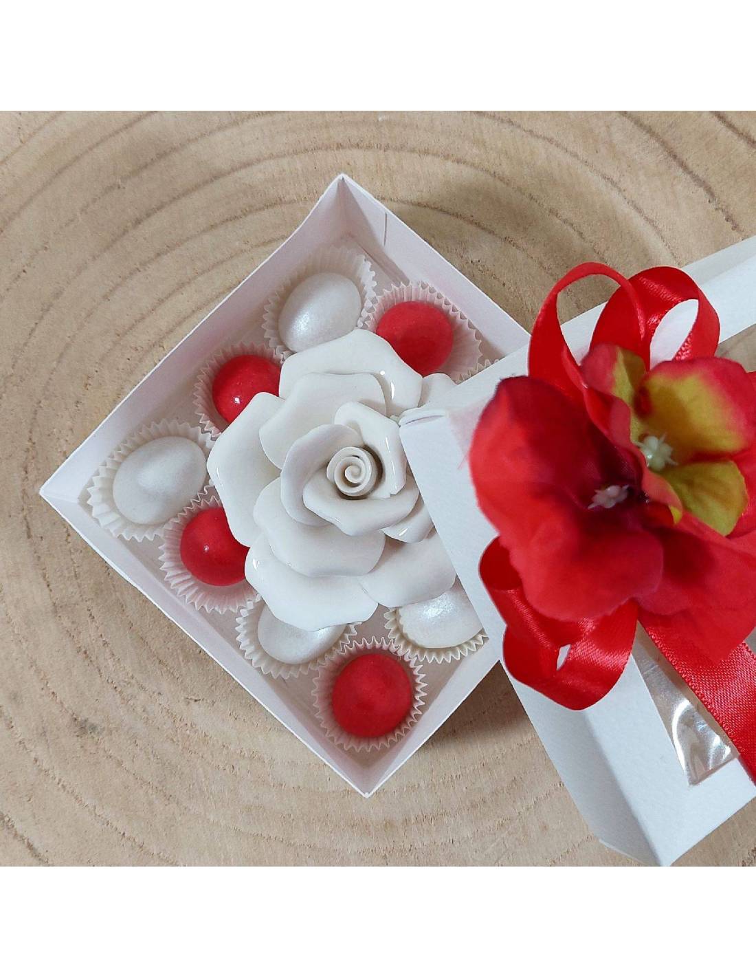 Scatola con rosa in porcellana bianca su rialzo e intorno pirottini con ciocomandorla Maxtris in due colori abbinati al fiocco esterno.
