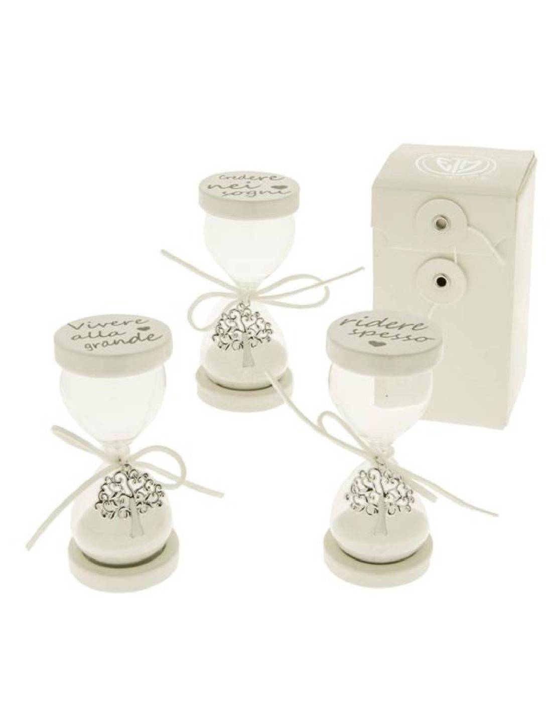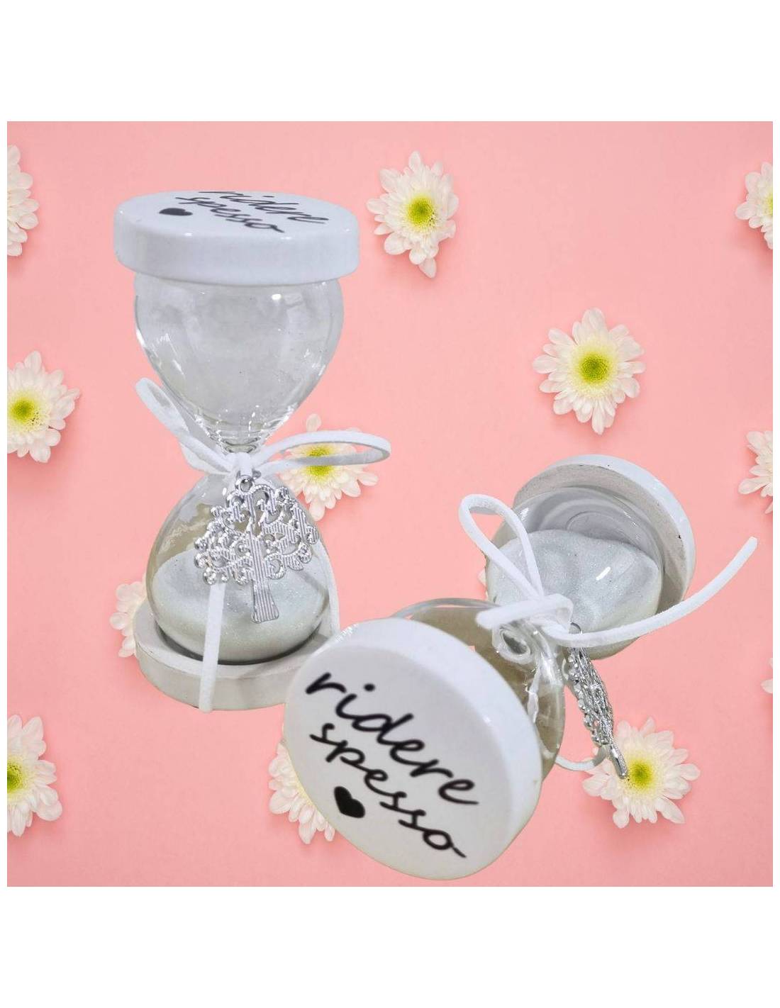 Bomboniere a clessidra in vetro con sabbia bianca e basi bianche con la stampa della frase ridere spesso, vivere alla grande, credere nei sogni e un cuore.