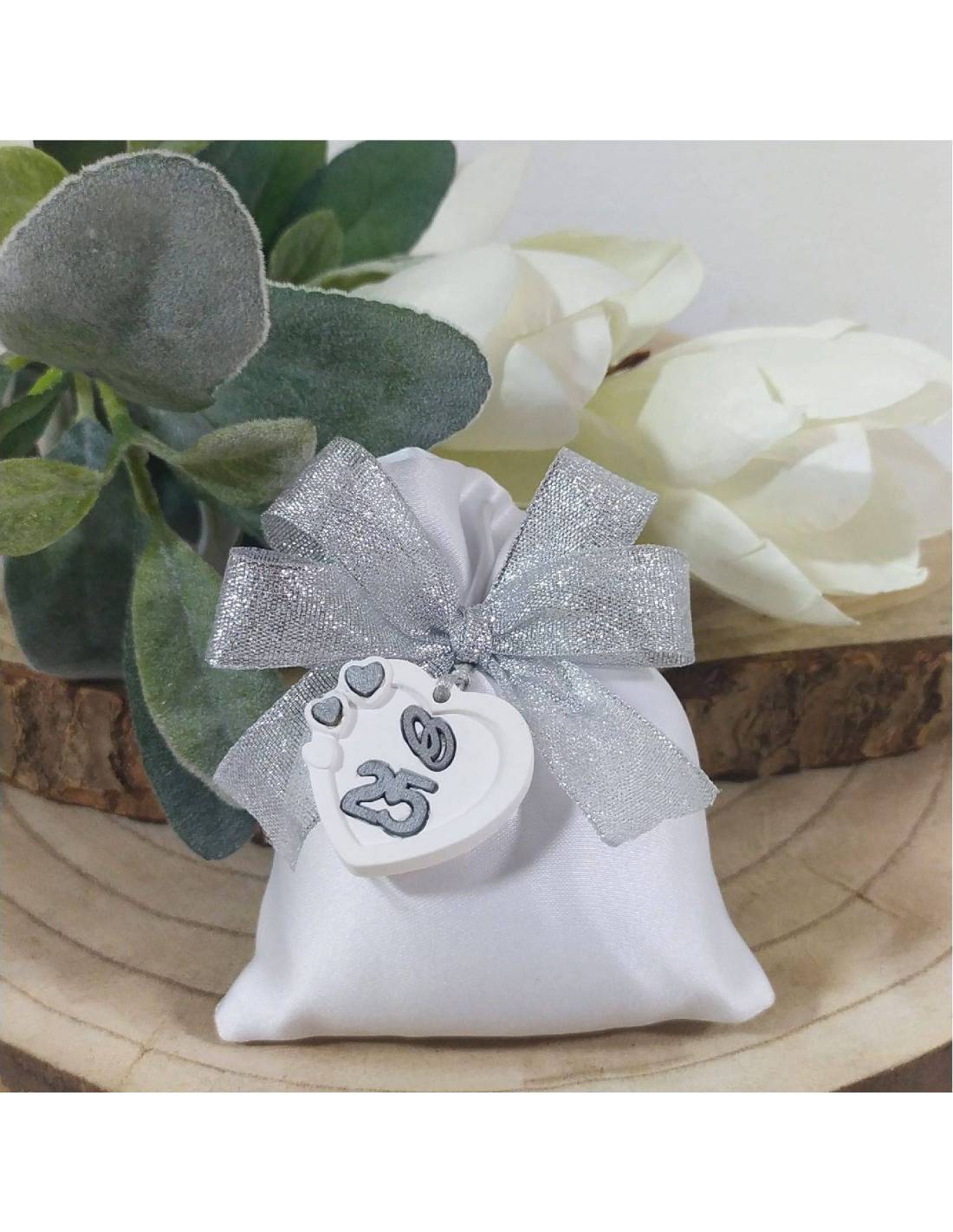 Bomboniere 25 anniversario matrimonio sacchetti con gessetto pendente a forma di cuore con all'interno il simbolo delle fedi e del numero 25.