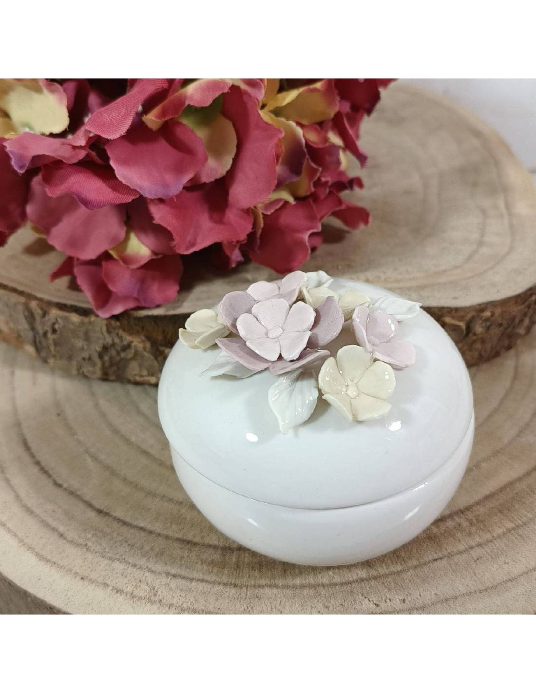 Bomboniere in offerta stock scatola portagioie in porcellana bianca con coperchio di fiori dalle nuance di colori pastello.