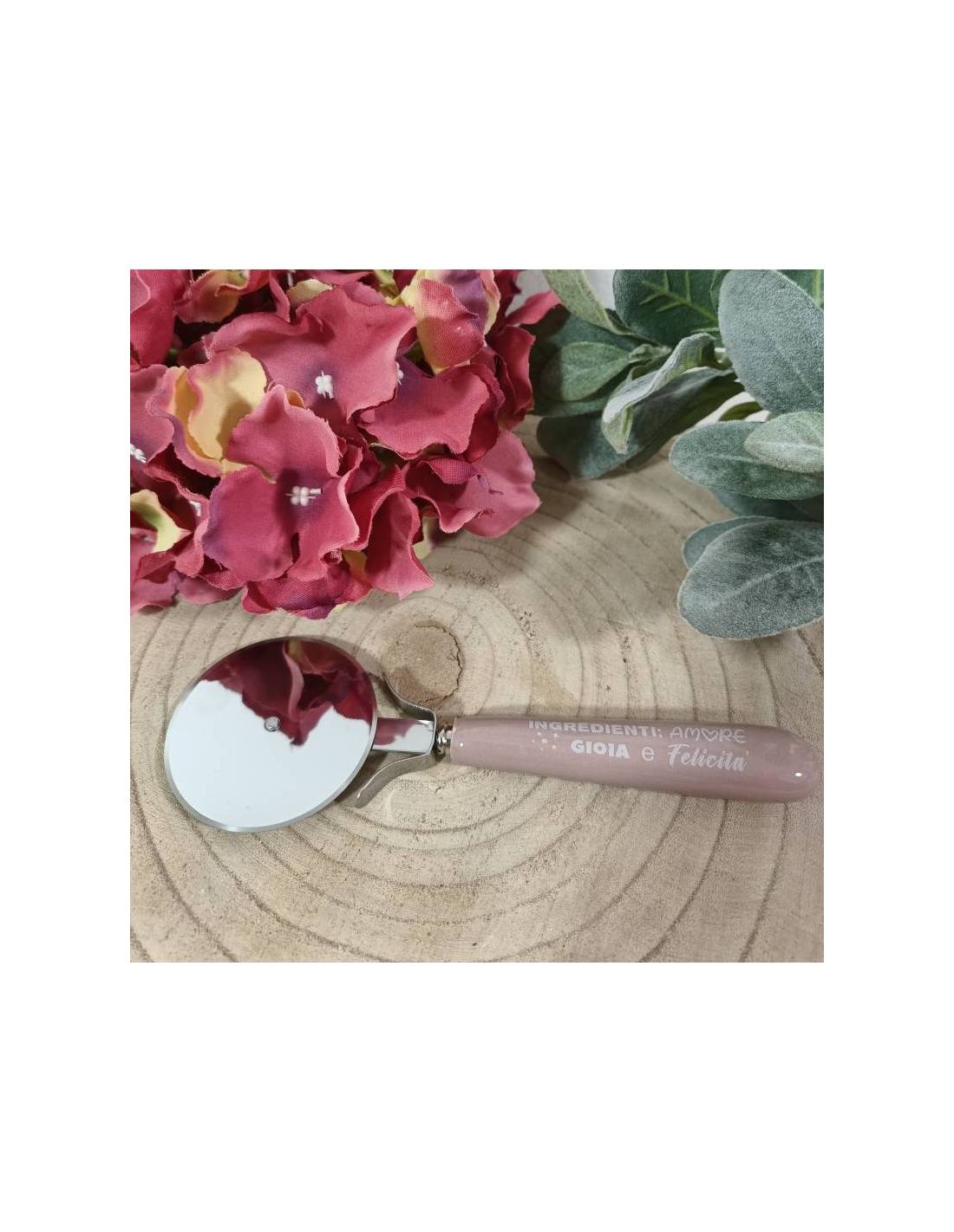 Bomboniere particolari e utili per Matrimonio tagliapizza con frase 'Ingredienti: amore, gioia e felicità'.