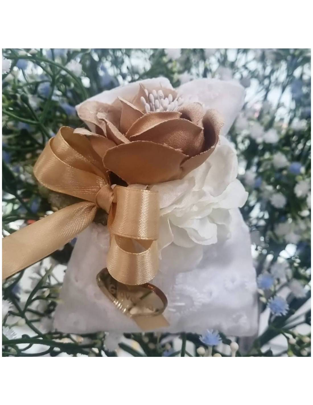 Sacchetti bomboniere matrimonio in pizzo bianco cotone e tulle ricamato decorato fiori e fiocco.
