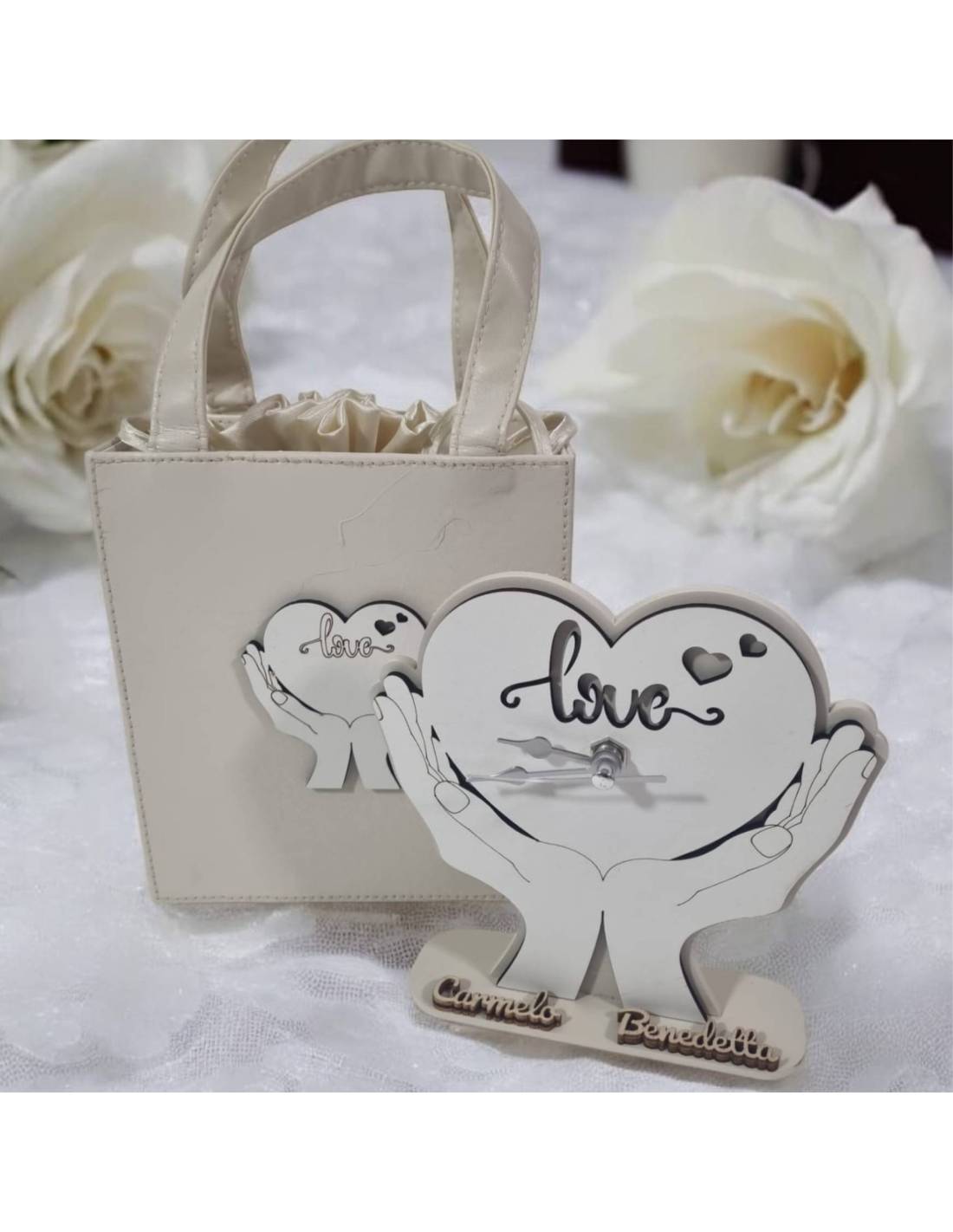 Orologio in legno che rappresenta il cuore con la scritta Love tra le mani compreso di scatola a borsetta in eco pelle con applicazione in legno.