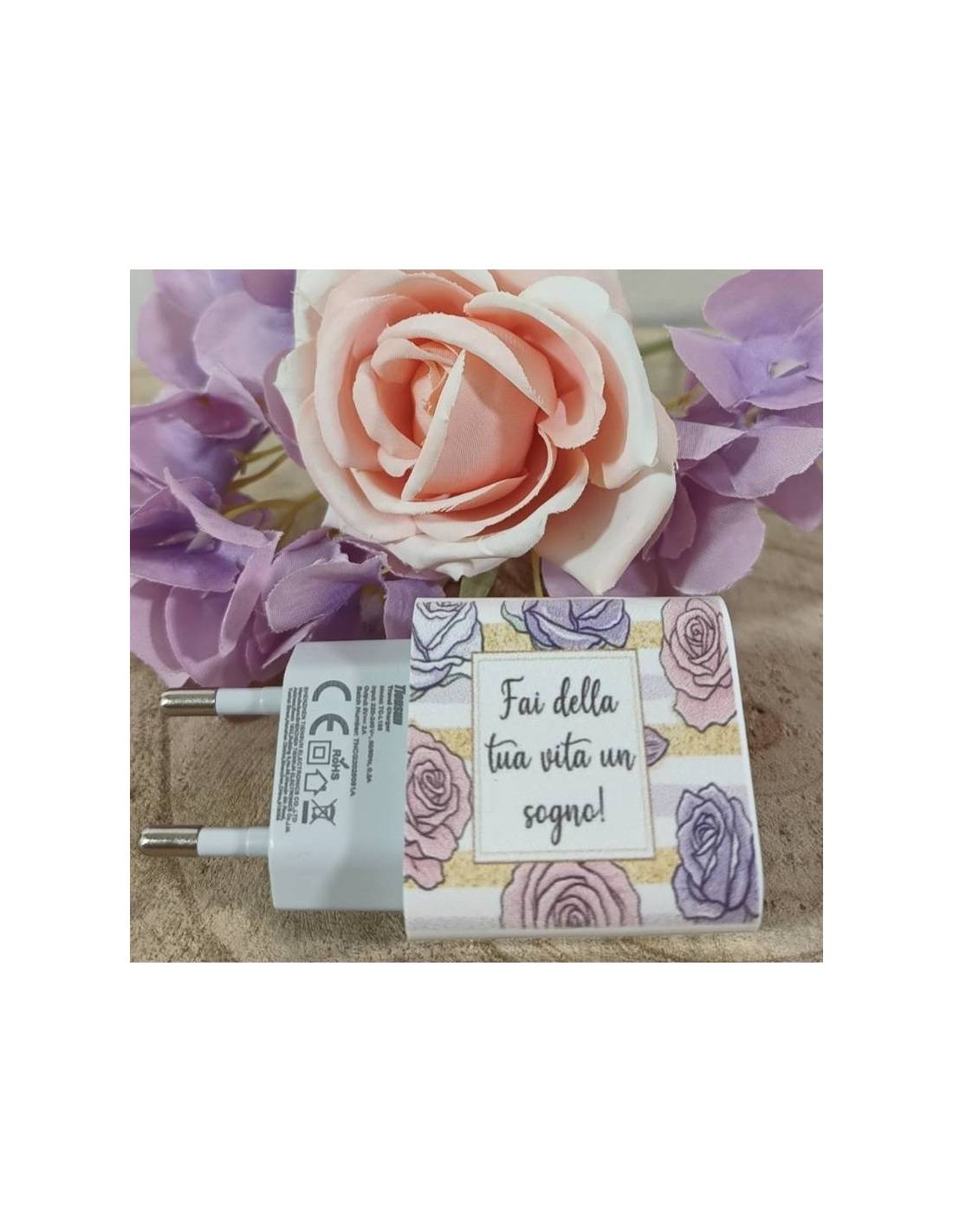 Bomboniere particolari caricatore presa USB Type-C abbellita con fantasia floreale elegante e frase "Fai della tua vita un sogno!".