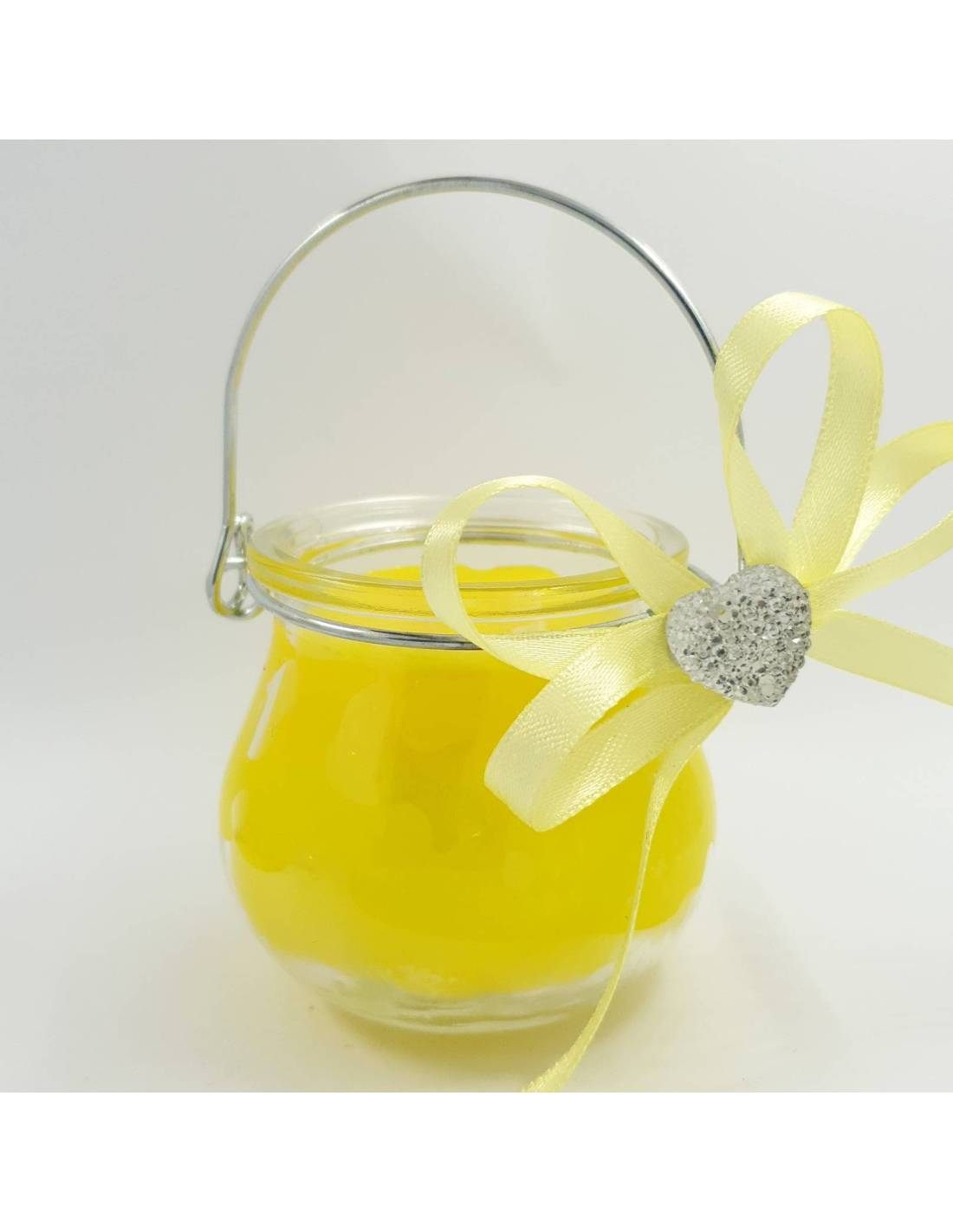 Bomboniera portacandela in vetro cuore strass, la candela ha il colore giallo in varie profumazioni e lateralmente è arricchita da un fiocco giallo con cuore