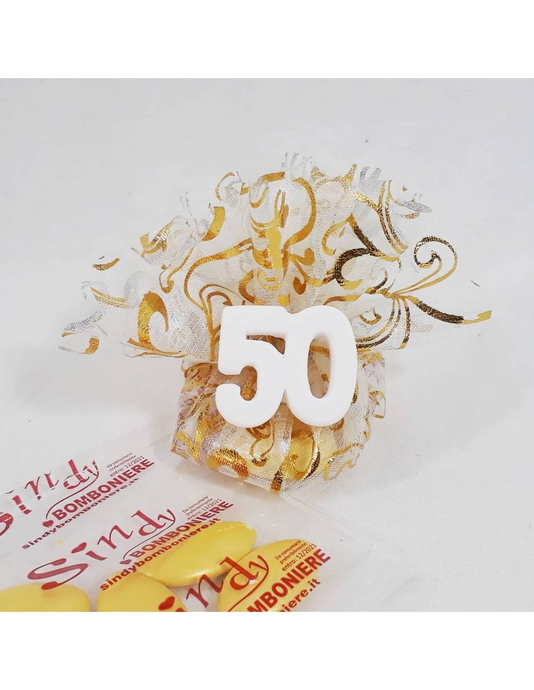 Sacchettino con tiranti portaconfetti per bomboniere anniversario di matrimonio, nozze d'oro. Il sacchetto in tulle ha delle decorazioni di colore oro e può contenere 5 confetti. Nel prezzo è compreso un gessetto profumato che ha la forma del numero 50. Originali bomboniere per 50°/cinquantesimo anniversario.