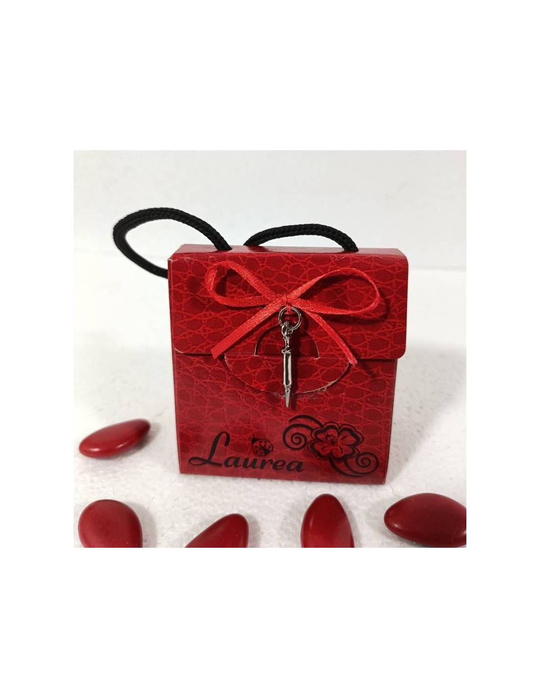 Completa di manico in corda nero con scritta "Laurea" e coccinella, e comprende anche il nastrino rosso dove inserirai il pendente a forma di siringa.