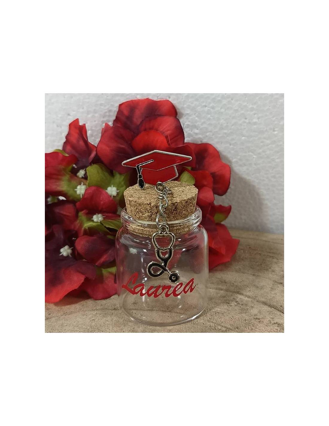 Vasetto in vetro con tappo in sughero che ha il pendente a forma di stetoscopio.