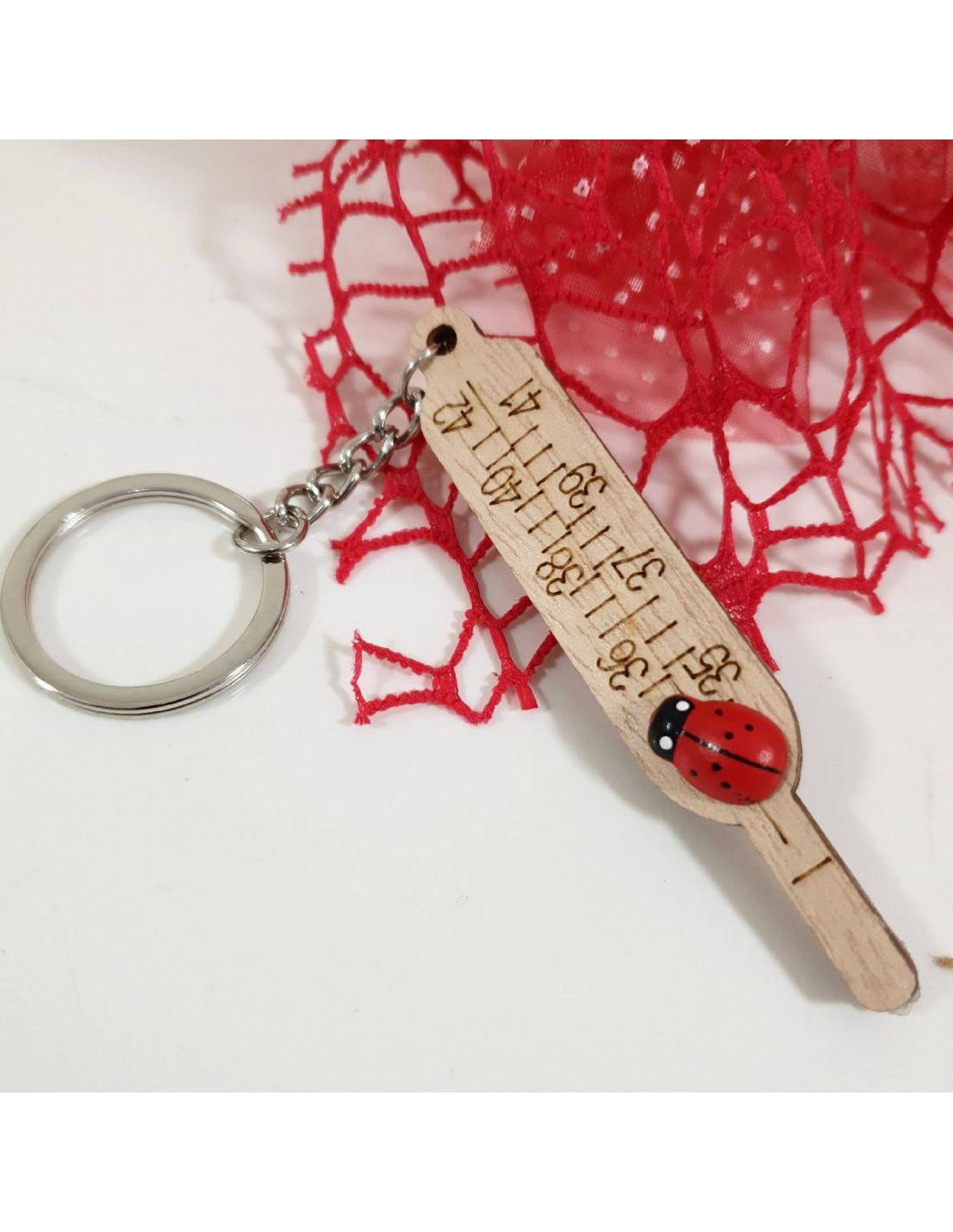 Bomboniere laurea medicina idee sacchetti rossi in raso decorato con fiocco rosso e portachiavi con termometro e siringa.