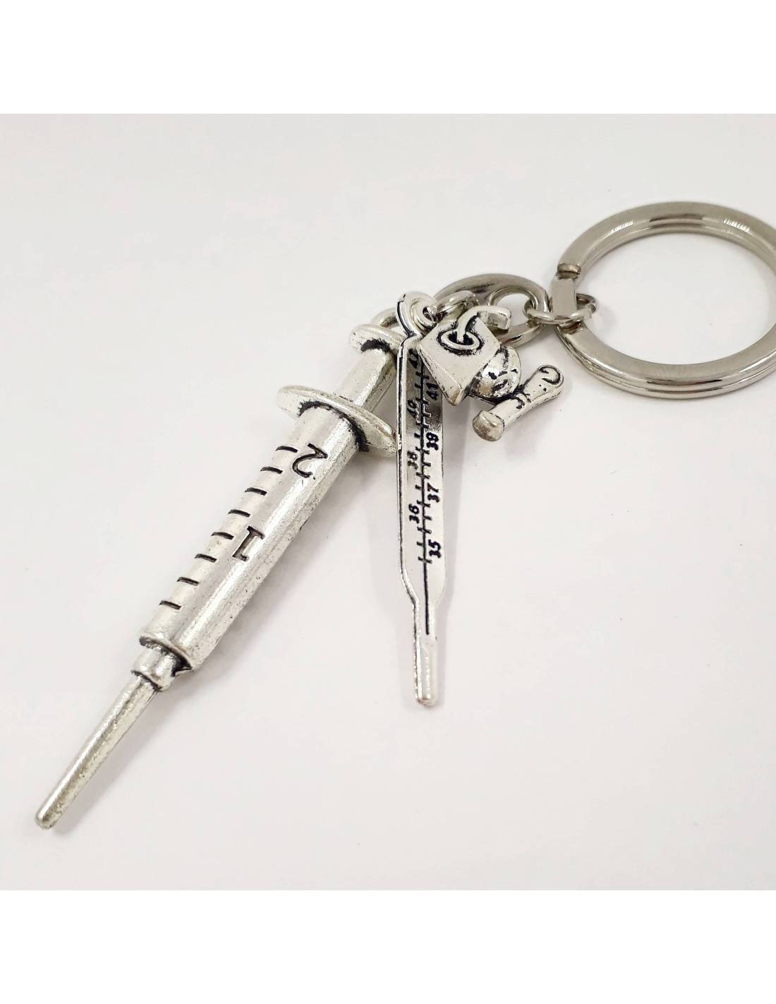 Portachiavi tris tocco, siringa e termometro materiale zama (metallo argentato che non annerisce).