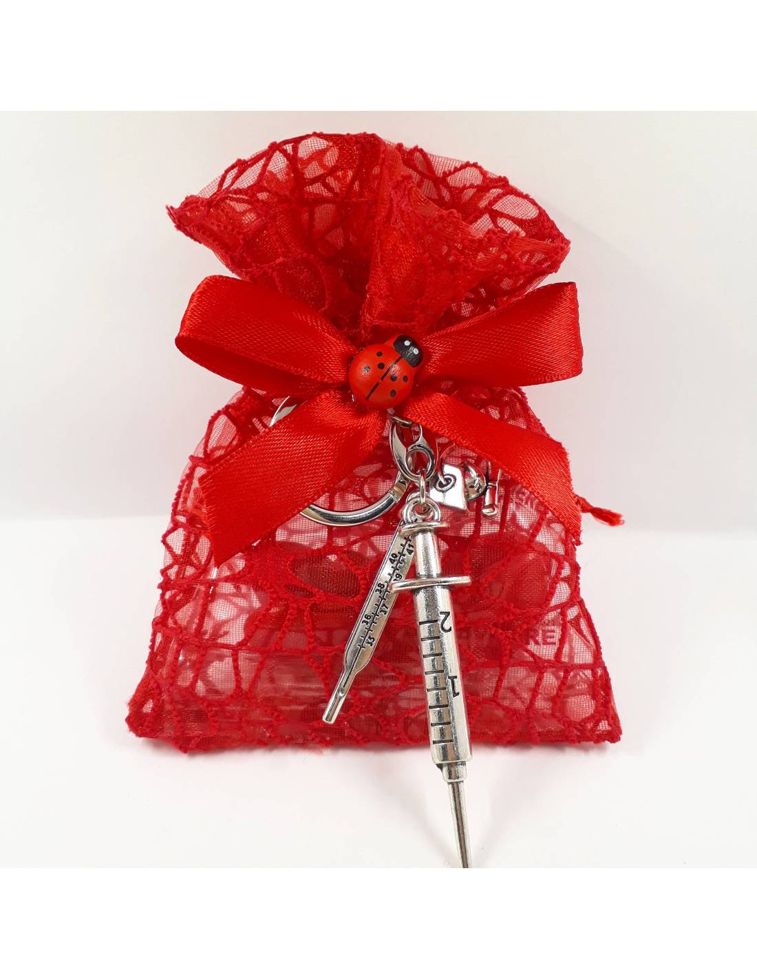 Sacchetto in rete bomboniere laurea FARMACIA tris tocco, termometro, siringa portachiavi confetti rossi