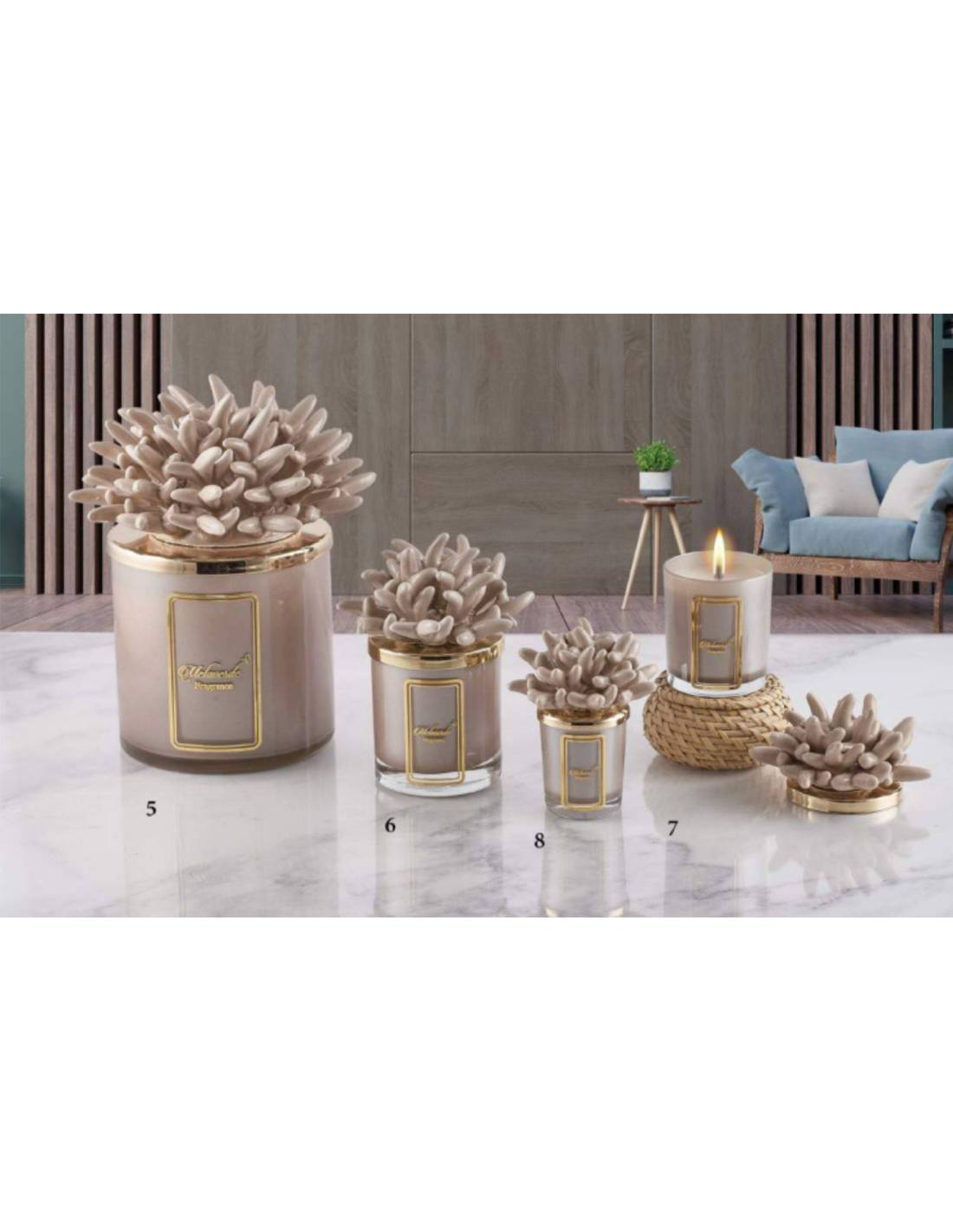 Candele profumate particolari in vetro tappo dorato e decoro fiore peonia in ceramica tortora.