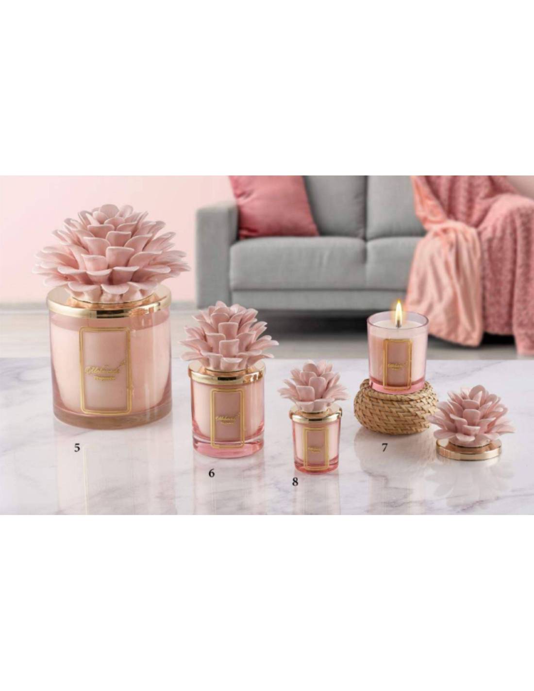 Bomboniere utili candele in vetro fragranza sfumature abbinate al fiore pianta in ceramica rosa.