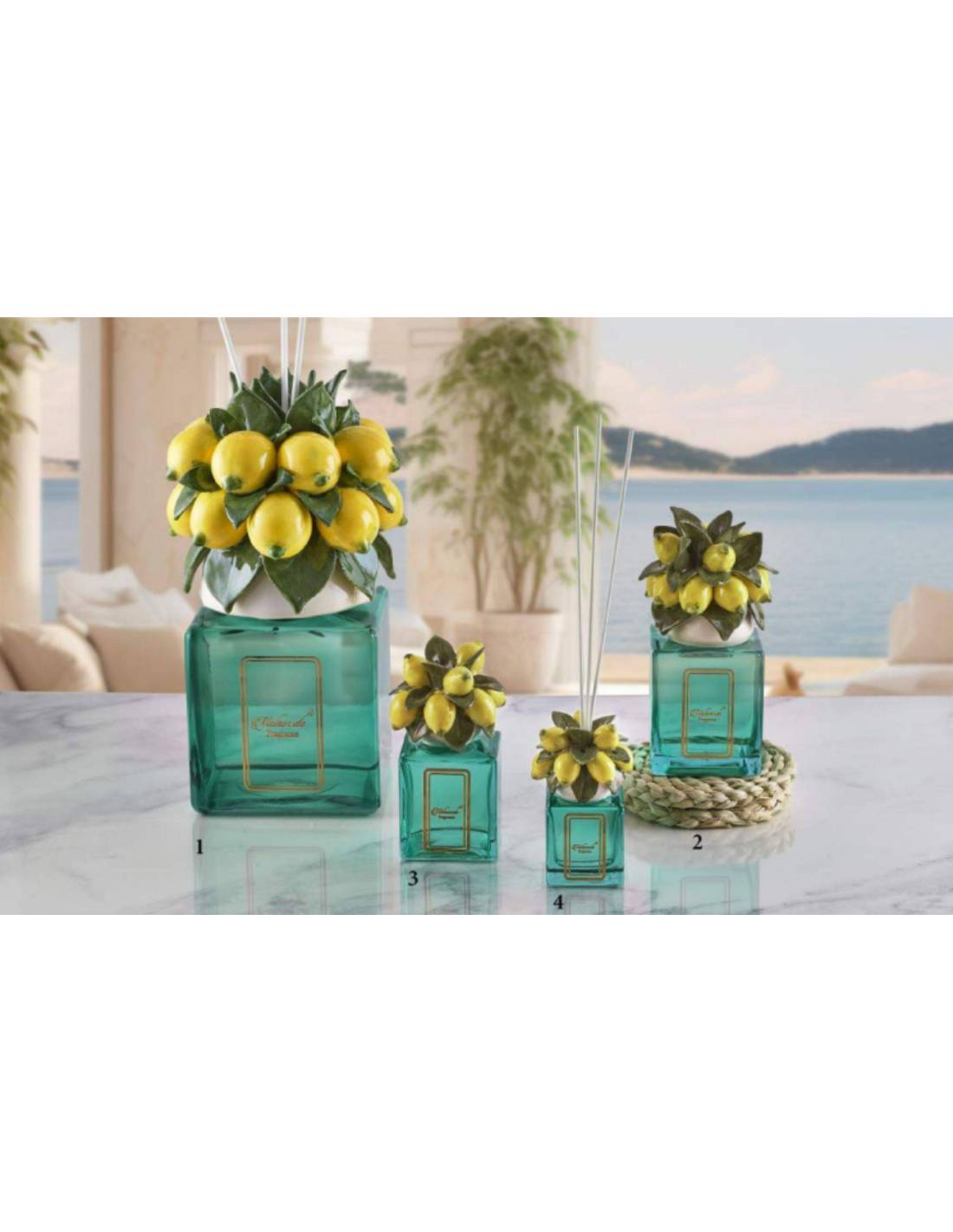 Diffusori ambienti vetro decoro pianta limoni in ceramica colorata con possibilità di scelta tra varie dimensioni appartenenti alla Linea Amalfi.