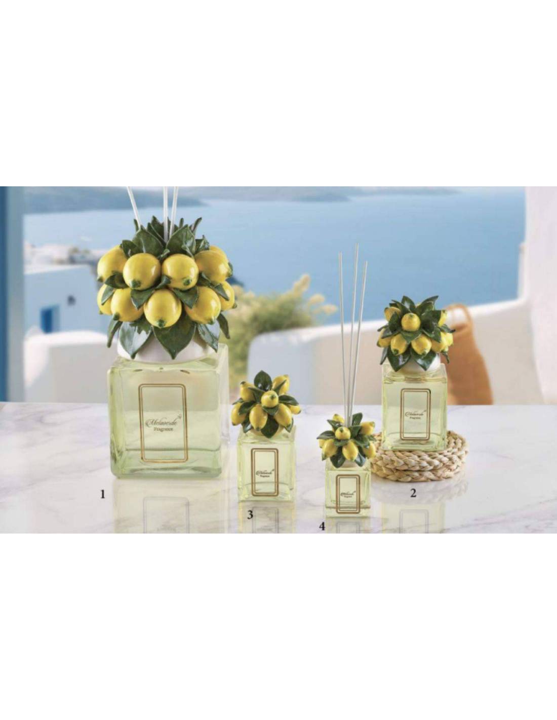 Profumatori per ambienti in vetro con decoro particolare pianta limoni in ceramica colorata appartenenti alla Linea Amalfi.