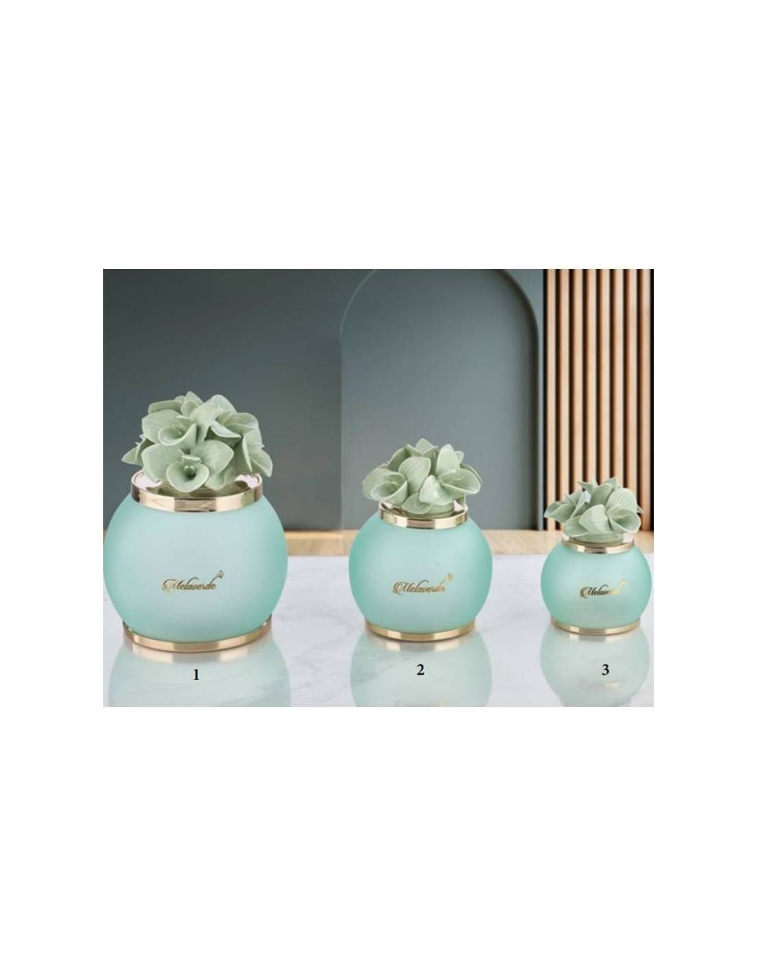 Bomboniere fiori bouquet orchidee in ceramica Capodimonte verde salvia su lampada led forma sferica con possibilità di scelta tra tre dimensioni.