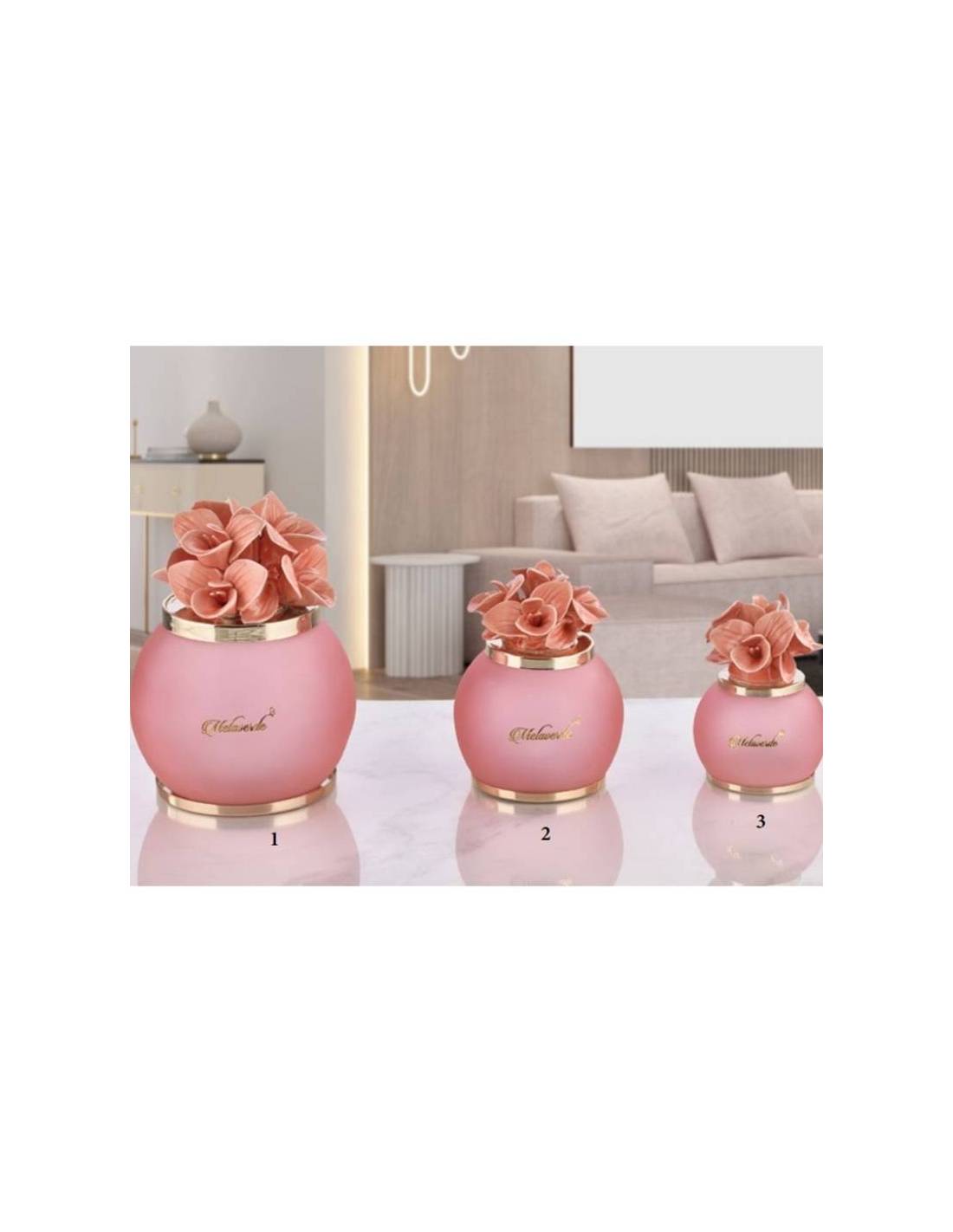 Bomboniere particolari lampade luce led forma sferica con decoro bouquet di fiori in ceramica Capodimonte orchidee color pesca.