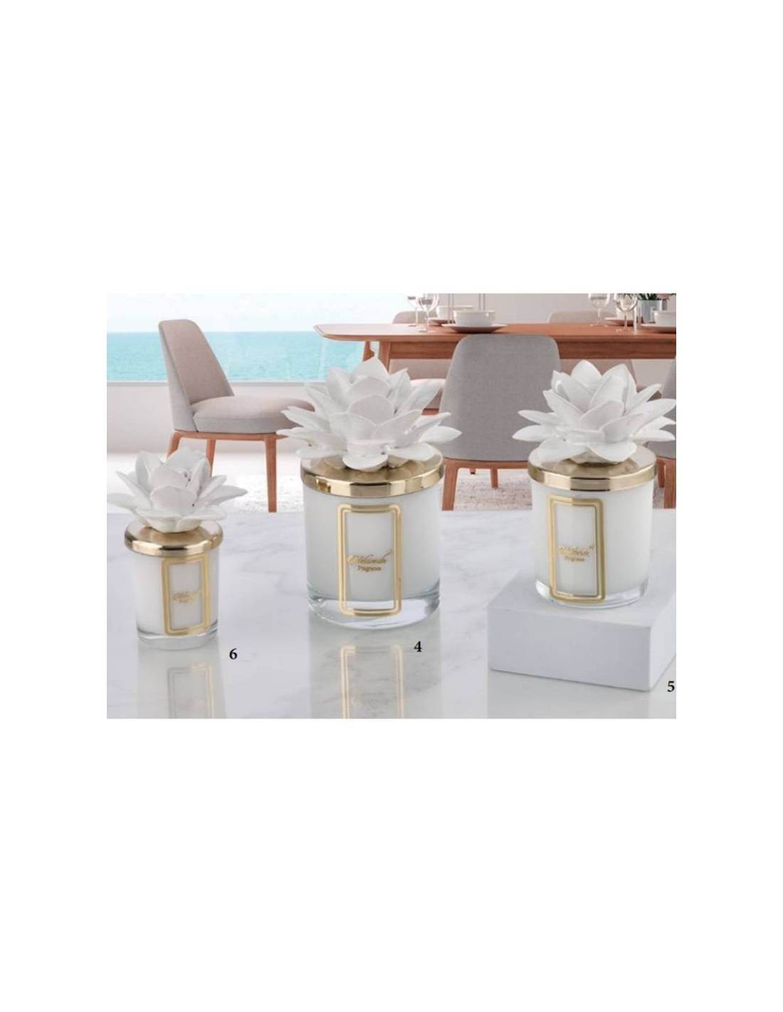 Bomboniere eleganti candele profumate particolari con tappo dorato e decoro fiore in ceramica Capodimonte bianca.