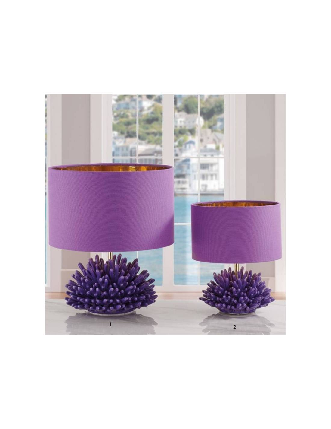 Bomboniere raffinate ed eleganti lumi a led decoro tema mare corallo viola in ceramica Capodimonte e paralume in stoffa con rifinitura interna dorata.