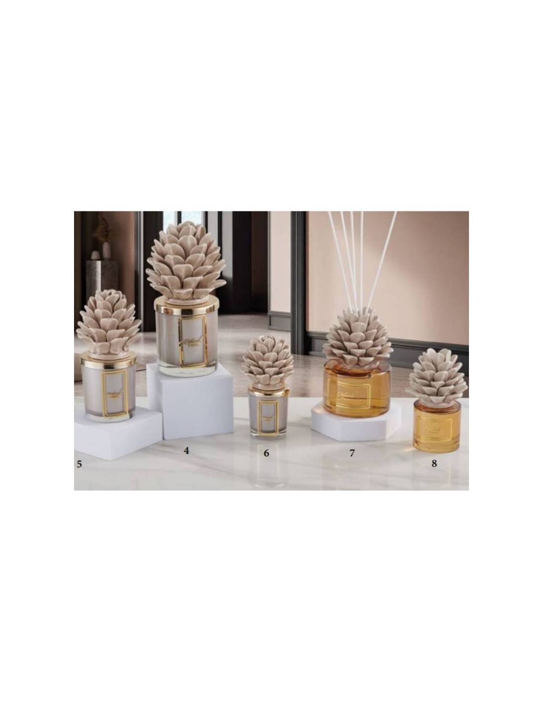 Bomboniere raffinate ed eleganti candele profumate particolari e profumatori per ambienti con decoro pigna in ceramica tortora.