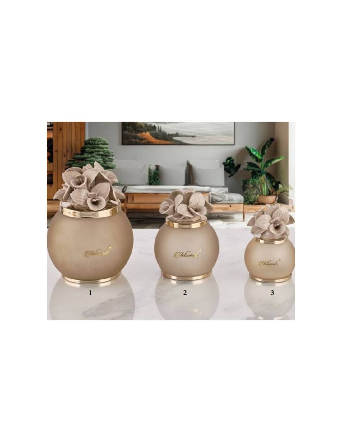 Lampade a led bomboniere originali Melaverde forma sferica con tappo dorato e decoro bouquet di fiori orchidee tortora.