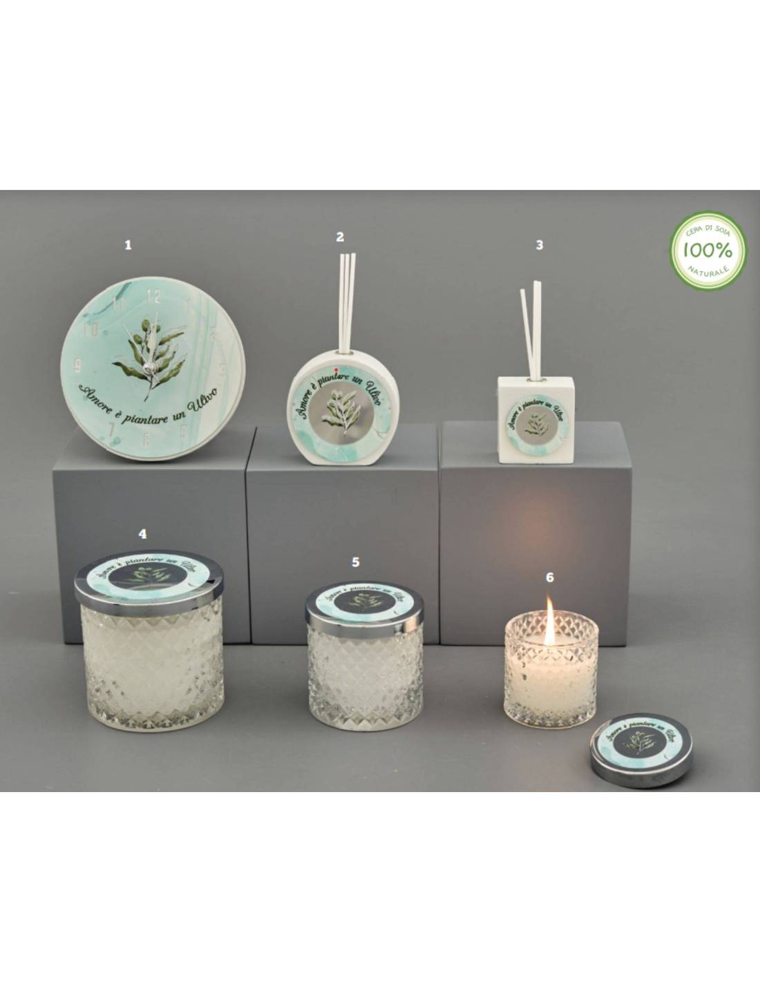 Bomboniere raffinate ed eleganti tema ulivo con frase 'Amore è piantare un ulivo' con possibilità di scelta tra orologio, diffusori e candele.