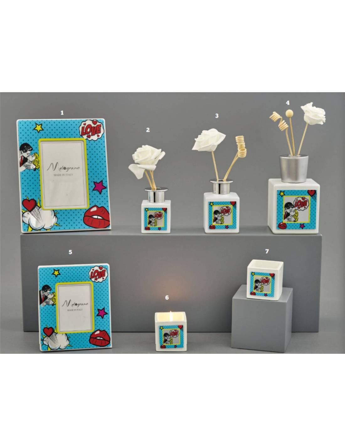 Melograno bomboniere particolari pop art con possibilità di scelta tra portafoto, diffusori o candele.